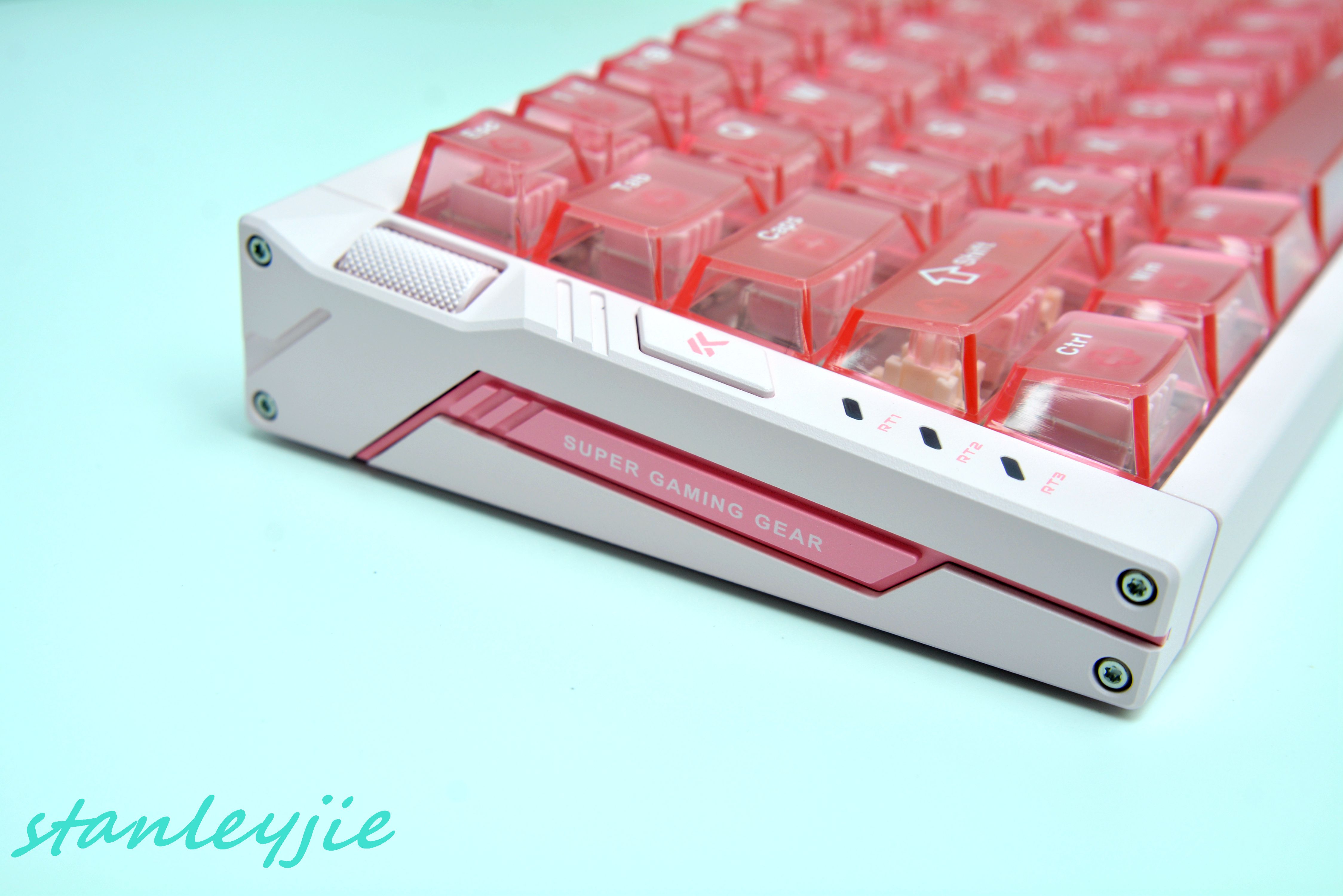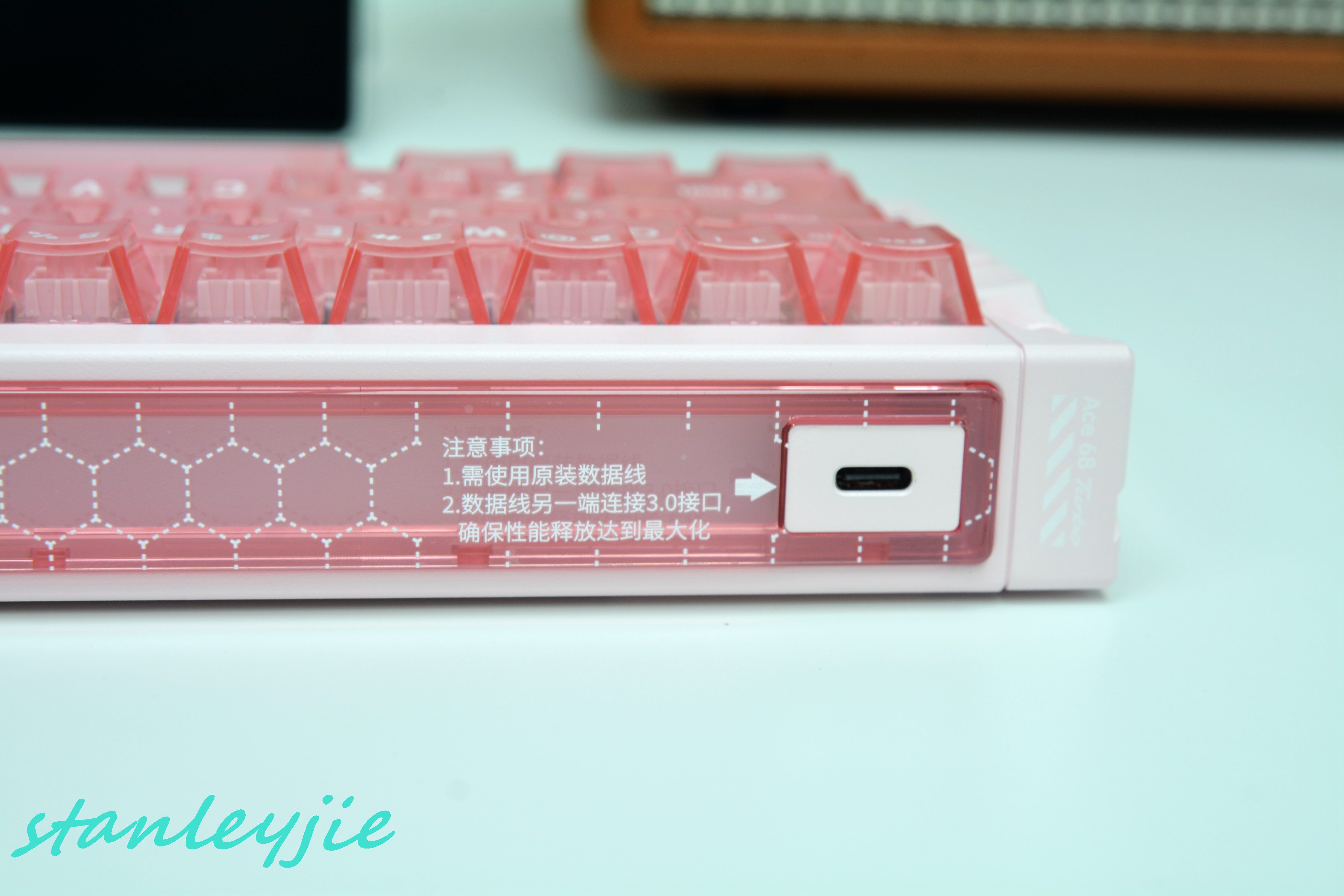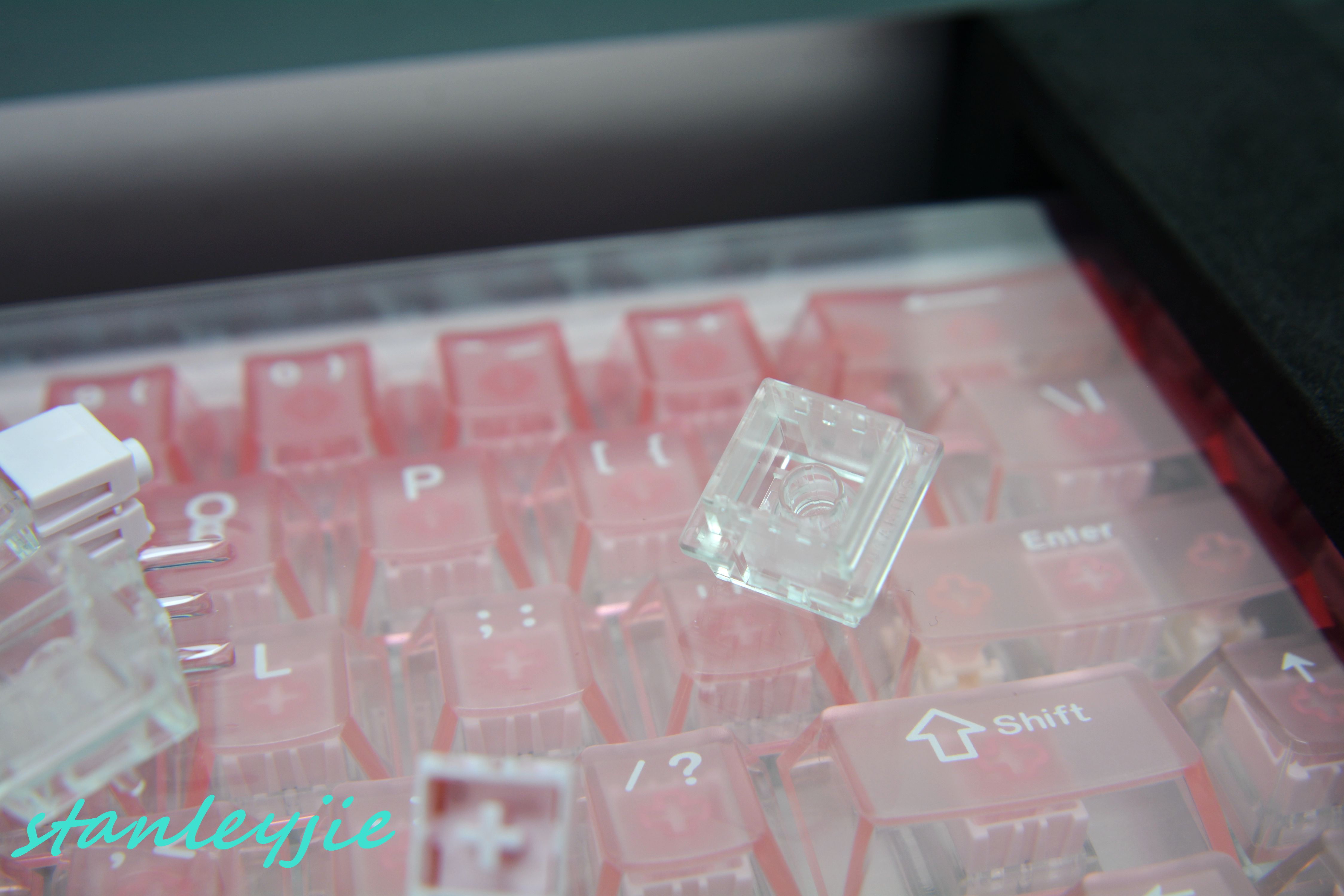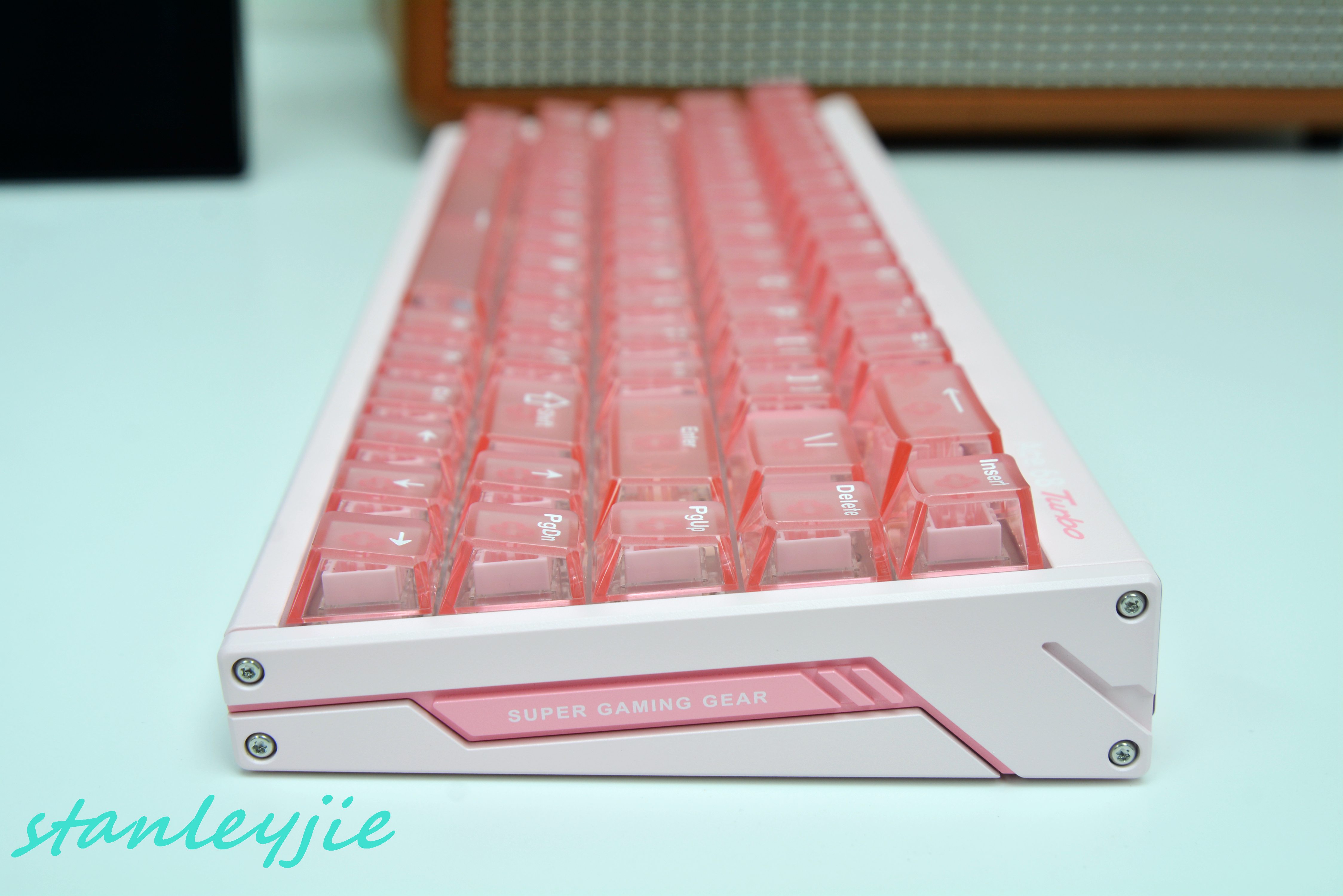 ☀键帽为 OEM 高度的粉色雾透款式,正面采用磨砂雾面工艺,印有清晰字符,既便于辨认又能提升指尖防滑性;侧边为全透明设计,为 RGB 灯光透出提供了良好条件。