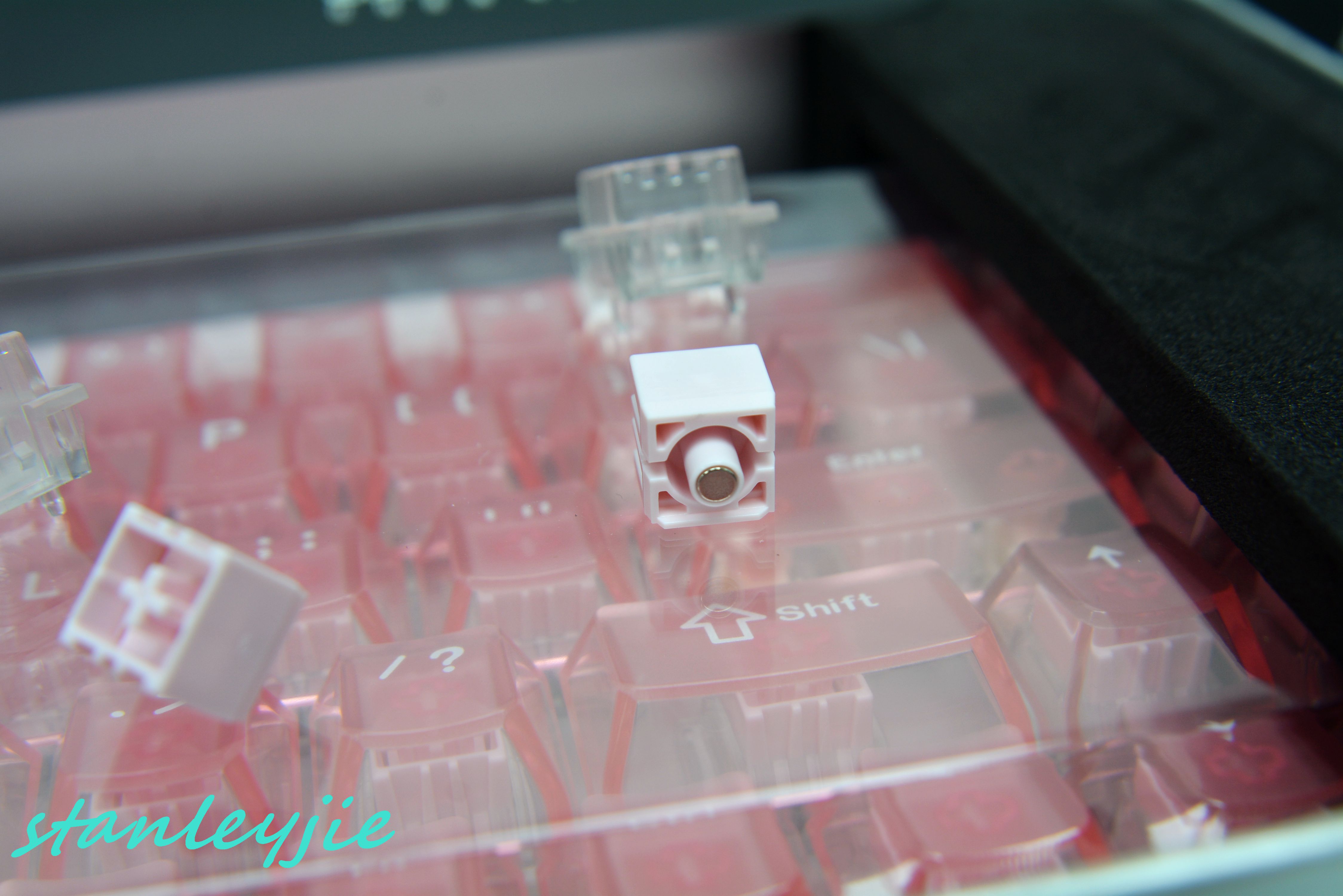 ☀粉色轴心是常见的十字轴心结构,但细看接触面更大,有9.35mm2,让手里更为均匀,这个也是泰山磁轴系列的特点;轴心两侧各有3道导轨;底部带有N52永磁铁,初始磁通量90Gs,触底485Gs。