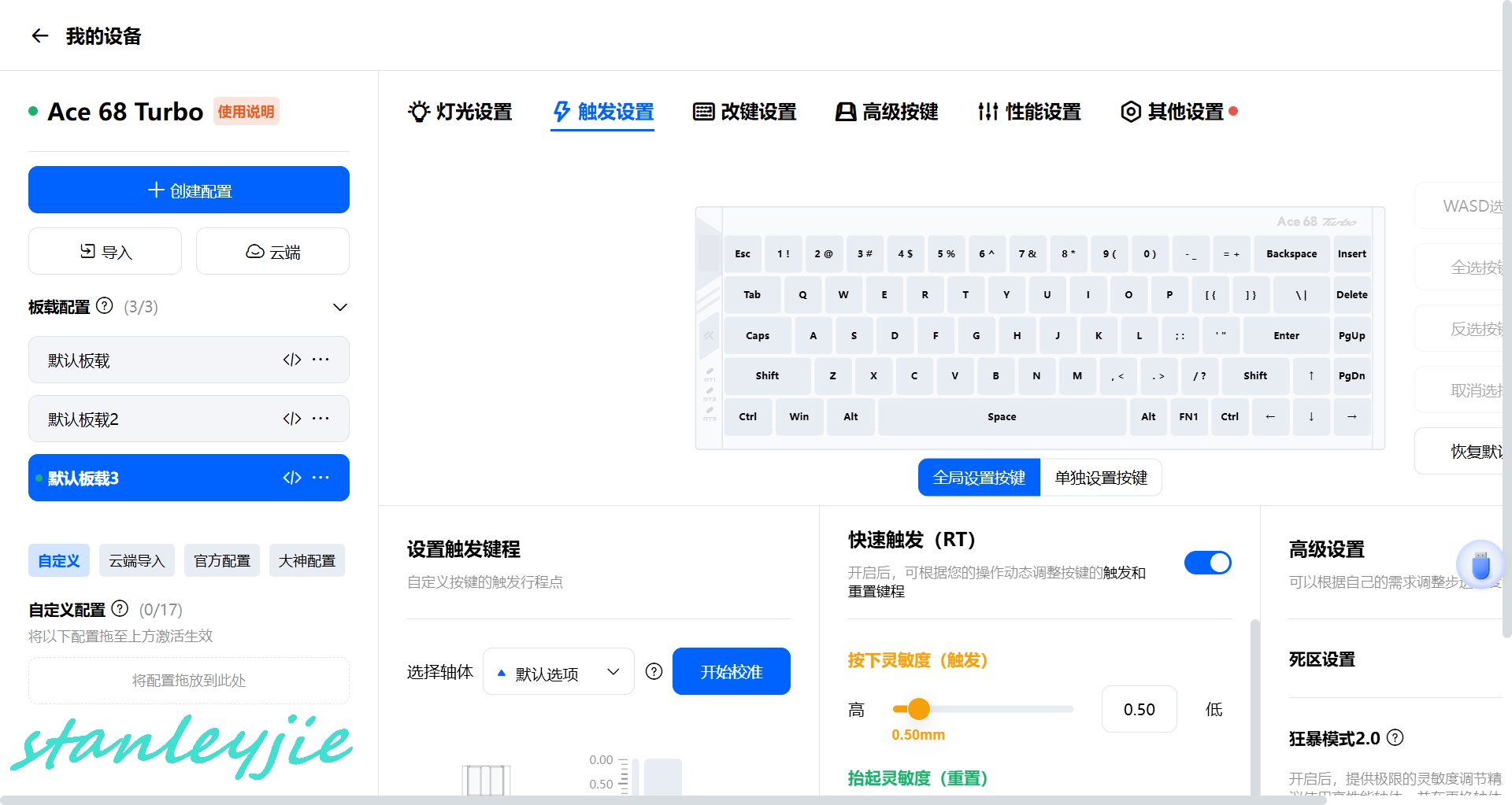 对于磁轴键盘而言,触发灵敏度调节是核心可玩性亮点,也是打造专属手感的关键。通过驱动,用户可根据自身使用习惯,对按键的按下触发点与抬起的灵敏度进行精细化调节,从根源上 DIY 出契合自己输入节奏的键盘手感 —— 游戏时可设置更短触发行程,追求毫秒级响应;办公打字时可调整为适中灵敏度,兼顾舒适与防误触。更实用的是,调好的参数可保存为3套独立板载配置,无需依赖驱动随时调用,通过键盘左侧的独立RT键即可一键切换,无缝适配游戏、办公、日常输入等不同场景,灵活性拉满。