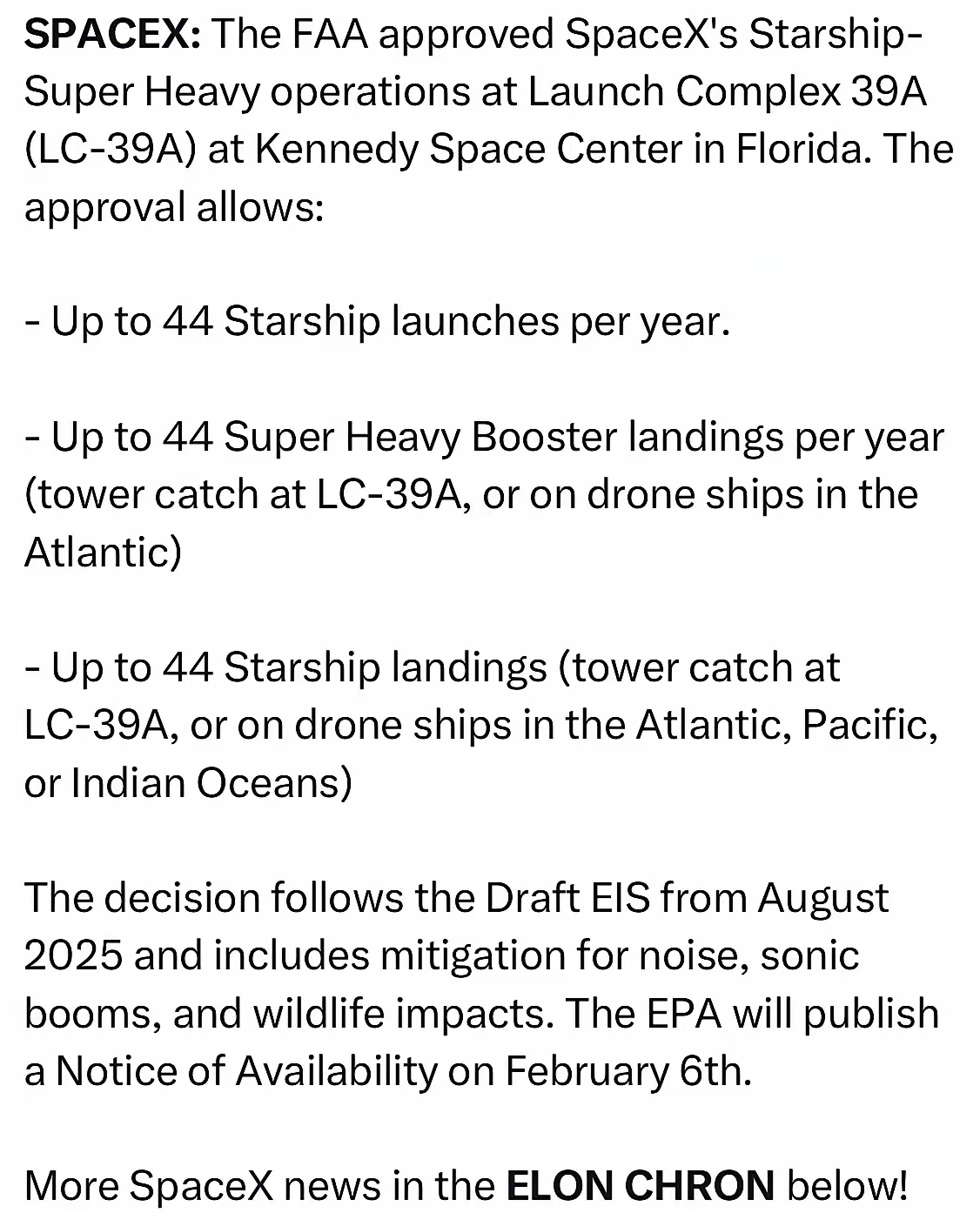 据悉,此次审批并非一蹴而就,而是经过了长达16个月的严格环境审查,始于2024年5月的意向公告,期间经过多轮公众意见征集,最终于1月29日由FAA商业太空运输办公室执行董事签署决策文件,正式敲定审批结果。