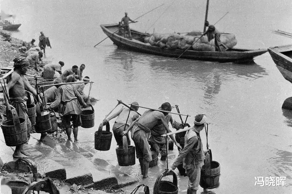 三、在长江挑水的,他们各自相邀在江边滩地搭有固定长跳板,以便取水。未入伙搭跳板的挑水者,每月需付 2—3 元钱,俗称“跳板钱”。