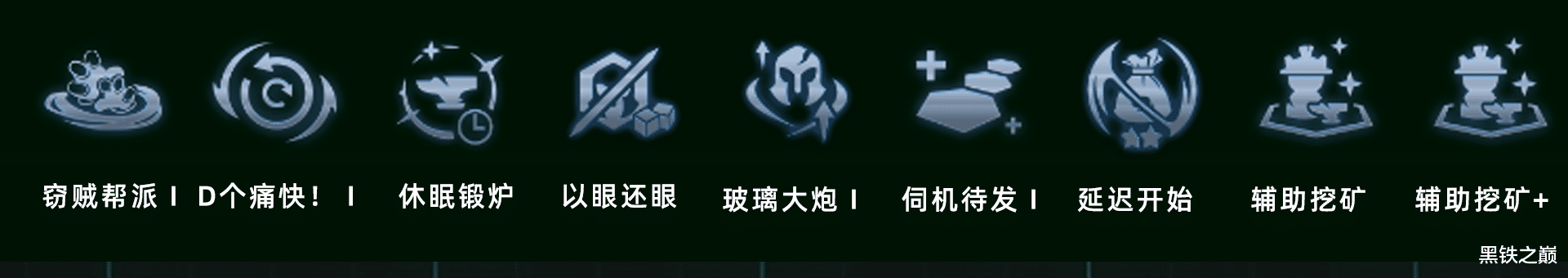窃贼帮派I、 D个痛快!、休眠锻炉、以眼还眼、玻璃大炮I、伺机待发I、延迟开始、辅助挖矿、辅助挖矿+