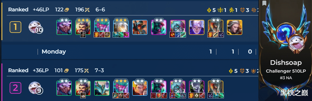 5局游戏3把都是辛迪加崔斯特,这个阵容无同行是可以把把玩的,非常适合新手。