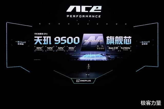 一加 Ace 6 至尊版搭载联发科当代旗舰芯——天玑 9500,其采用台积电第三代 3nm(N3P)工艺与全大核架构,相比上代 CPU 性能提升 32%,功耗降低 55%。GPU 层面,天玑 9500 搭载移动端最强 GPU G1-Ultra,峰值性能相较上一代提升 33%,光线追踪渲染性能大幅提升 119%,功耗降低 42%。