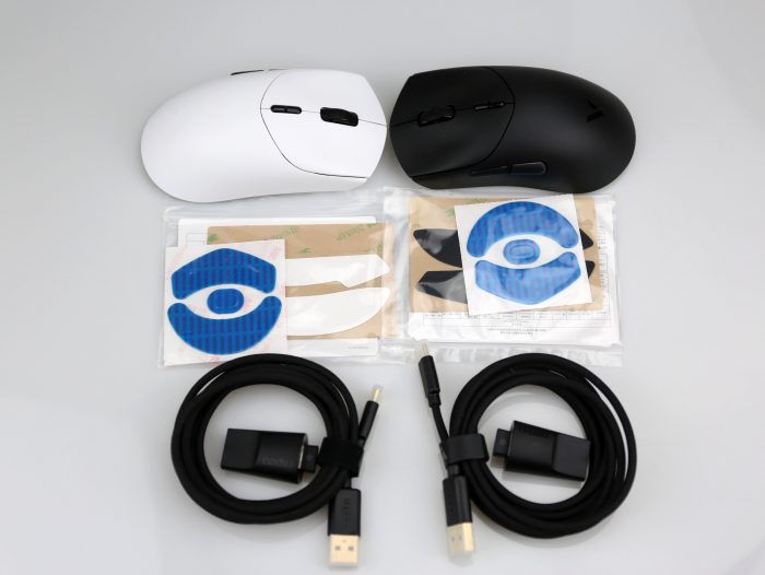 雷柏 VT7 和 VT7 Max 的包装设计较为简约,整体风格统一。打开包装,两款鼠标均配备了带 RGB 电量指示灯的 nano 8K 接收器、USB转接器、一条 USB A-C 高速数据线、一套按键防滑贴和备用脚垫,配件相当丰富。