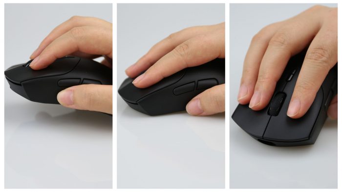 外观方面,两款鼠标完全一致,均采用右手人体工学型对称设计,尺寸为 127.4×64.3×39.8mm,大手用户在使用抓握、趴握和指握三种握姿,都能完美驾驭,而且鼠标按键处还设计有手指凹槽,让控制更稳定。