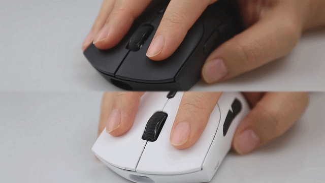 两款鼠标外壳都采用类肤磨砂处理,触感细腻防滑,对汗手用户相当友好。鼠标腰身左侧裙微微内收,右侧裙平滑延伸,背部弧度贴合掌心,长时间握持不易疲劳。