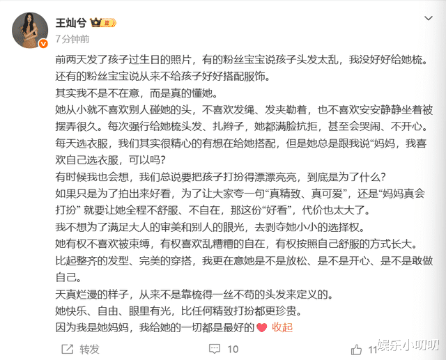 王灿的发文引发不少妈妈们的共鸣,王灿表示:自己的女儿有权不喜欢被束缚,有权喜欢乱糟糟的自在,有权按照自己舒服的方式长大。比起整齐的发型、完美的穿搭,她更在意的是女儿的放松、开心、敢做自己。这段话真的说出了好多妈妈的心声,这才是妈妈对孩子最深沉的爱!