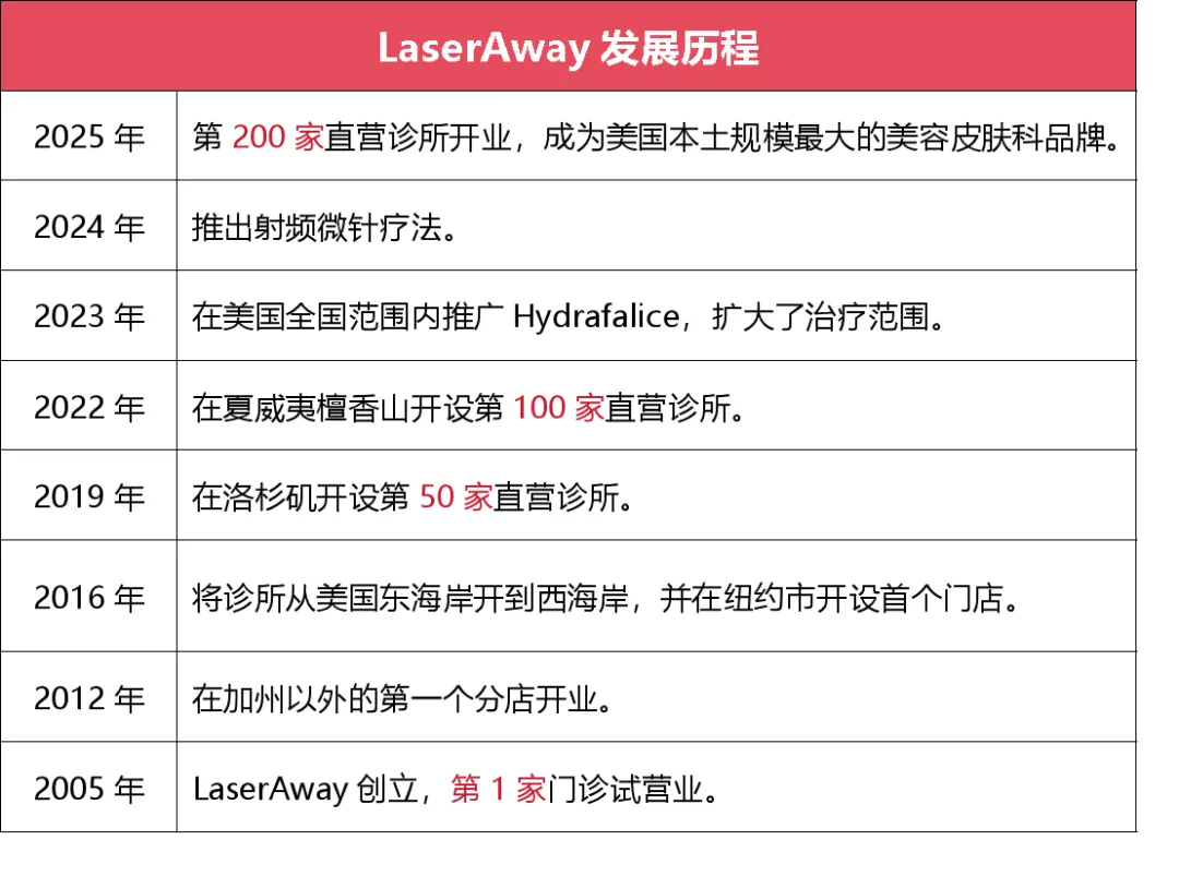 正是得益于战略坚定、成本优势和以数据驱动的运营体系搭建,LaserAway得以稳健发展20年,并成功拓展到200家直营店,成为全美最大美容皮肤科连锁诊所。