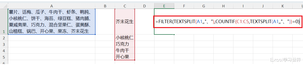 =FILTER(TEXTSPLIT(A2,,"、"),COUNTIF(E12:E14,TEXTSPLIT(A2,,"、"))=0)