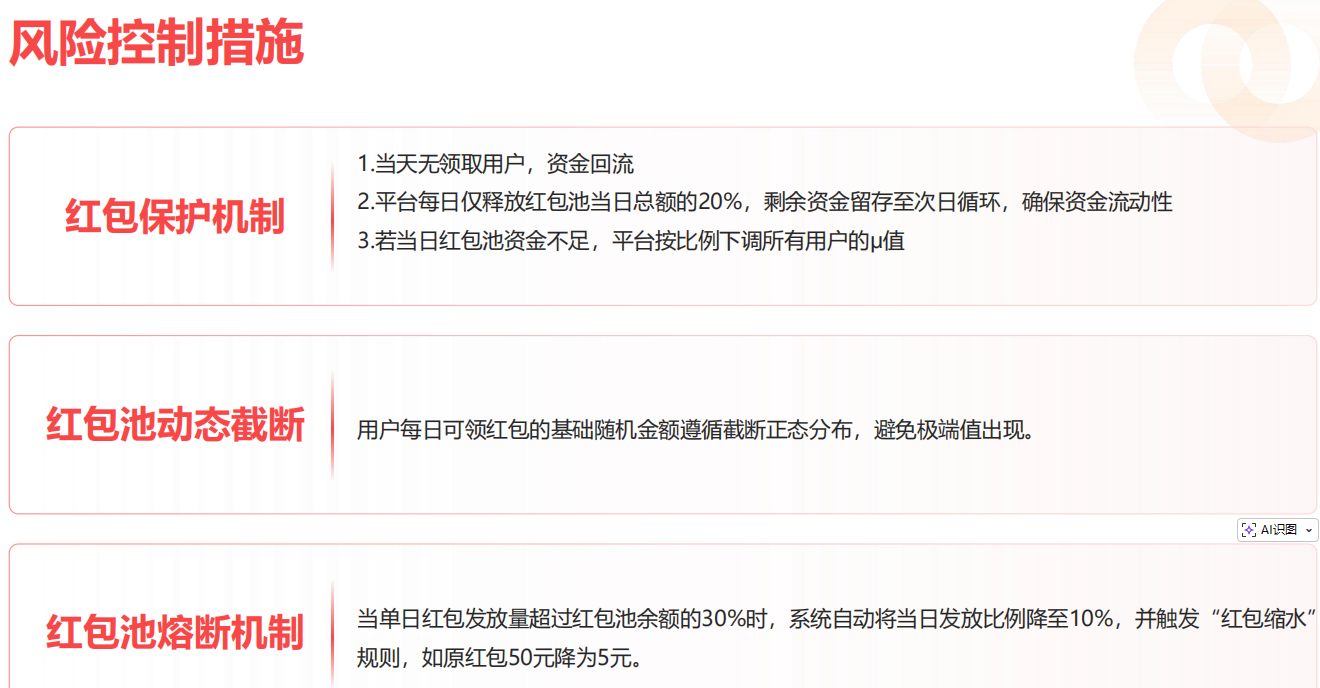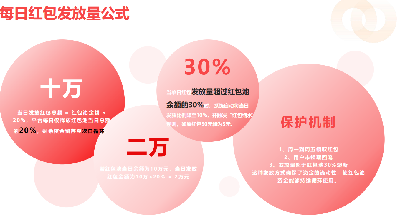 ✅资金不浪费:让利资金 + 平台补贴 + 广告收益构成 “财富池”,每日仅释放 20% 发红包,未领取金额全额回流;