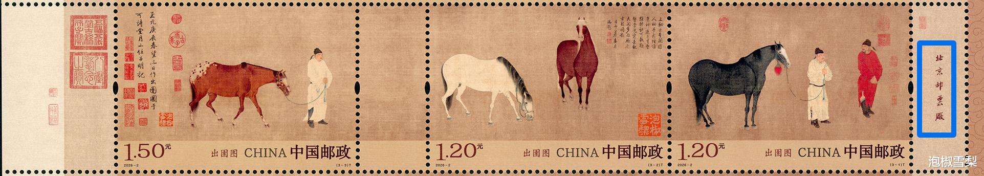 2026年3月3日,中国邮政发行《出圉图》邮票1套3枚,北京邮票厂胶版印刷;无齿邮票1套3枚,河南邮票厂胶版印刷,宣纸品种,采用局部丝网工艺,设计者苗慧,套票计划发行量460万套,折合大版115万版;无齿邮票121.0956万套,折合大版30.2739万版。全部总面值1912万元,总售价2671万元。
