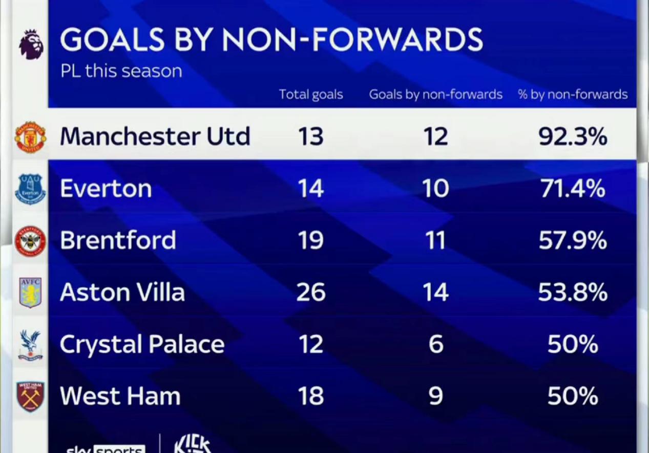 这一数据让人感到不可思议。曼联本赛季的进球绝大多数都是由非前锋球员完成的,占据了整体进球数量的92.3%。这种情况显然远远领先于其他英超俱乐部。