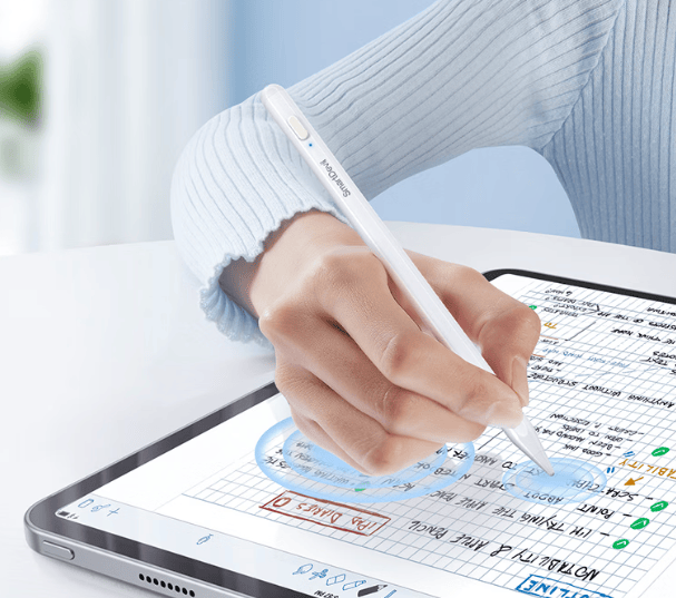 这款电容笔具备全局防误触功能,双手搭在屏幕上也能精准书写,并且它搭配POM材质笔尖的同时还内置了高性能稳定芯片,书写的顺滑度还不错,较少出现断触的情况。值得一提的是它有随手写功能、滑动截屏功能以及涂鸦停顿功能,在使用的时候能快速操作,实用性不错。此外,在笔帽上有三灯提示电量情况,比如红灯亮时就代表电量小于30%,使用户告别电量尴尬的情况。在充电方面,它支持磁吸充电,而且满电后可以连续使用10h,续航能力还不错。不过这款设备静置五分钟会自动进入休眠模式,虽说能节省电量,但频繁的休眠可能会打断用户的创作节奏。