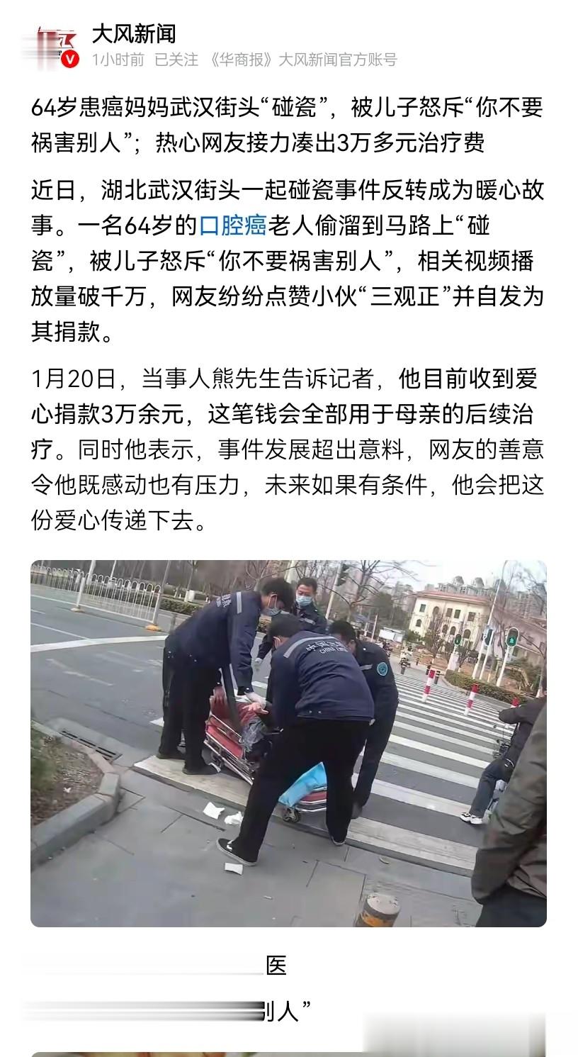 近日,武汉网友发布的一条视频碰瓷视频引发了大家的共鸣,事件中一位64岁的母亲因为患有口腔癌,在治疗费上捉襟见肘,于是动了歪脑筋,想通过碰瓷的方式弄点钱,来支付治疗费。