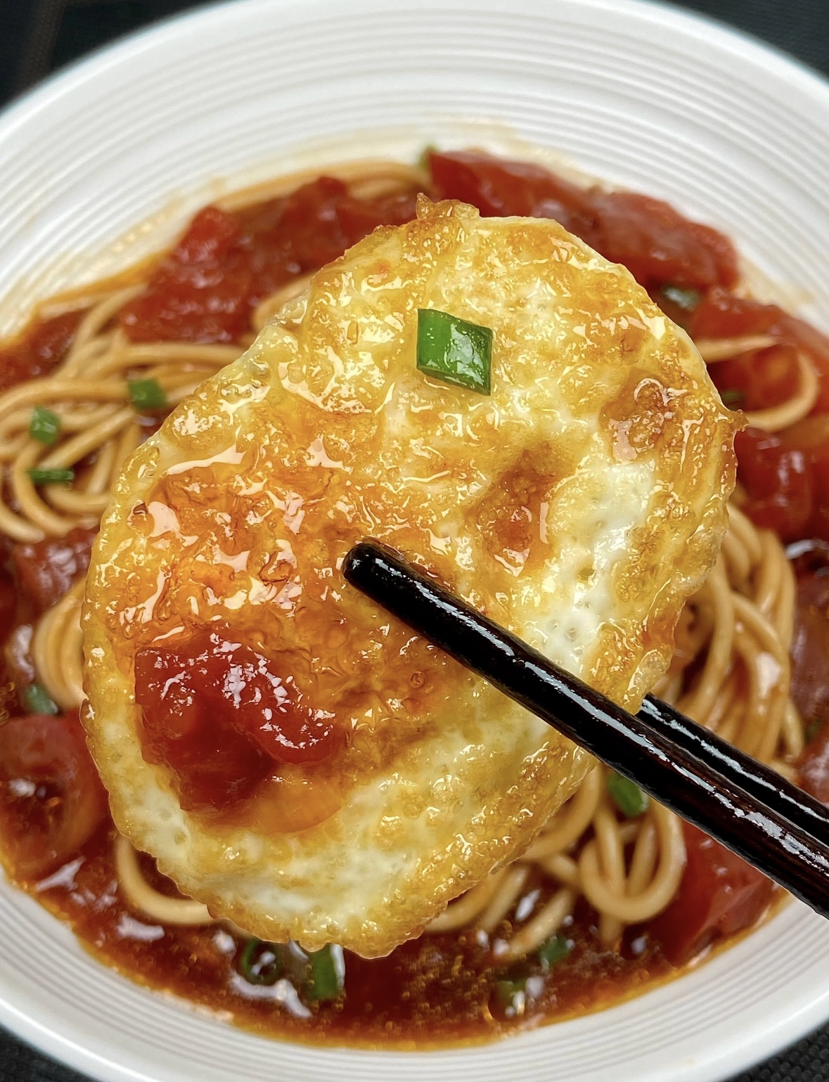 番茄炒成酱后,加半碗热水,生抽两勺、蚝油半勺、白糖一小撮,盐别多,番茄本身有滋味。汤汁咕嘟冒泡时,把七分熟的面条捞进来,再轻轻把荷包蛋搁在最上面,盖盖子,转小火焖三分钟。这三分钟是魔法时间:面条在番茄汤里打滚,像做酸酸甜甜的SPA;荷包蛋把溏心悄悄流进汤汁,让味道更丝滑;葱花撒下去,绿得发亮,像给整锅面点了一颗小星星。