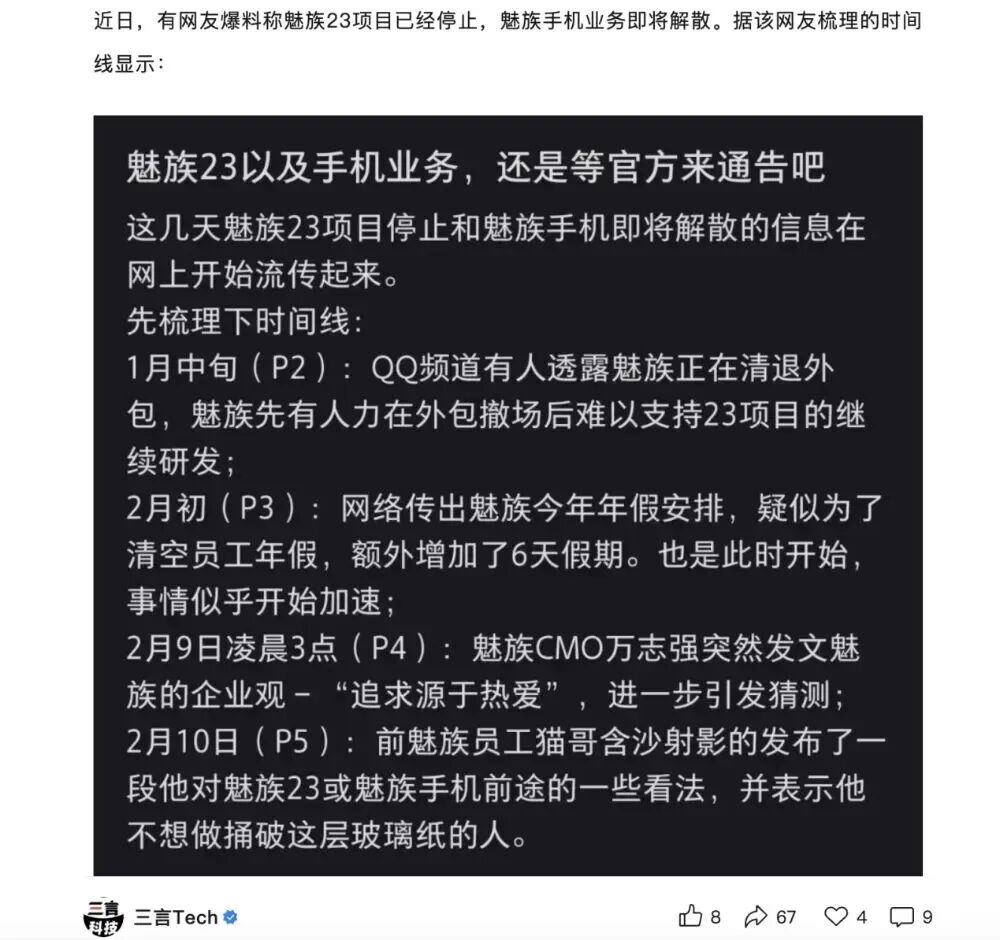 据@三言Tech 发文,近日有网友称魅族 23 项目已经停止,魅族手机业务即将解散。