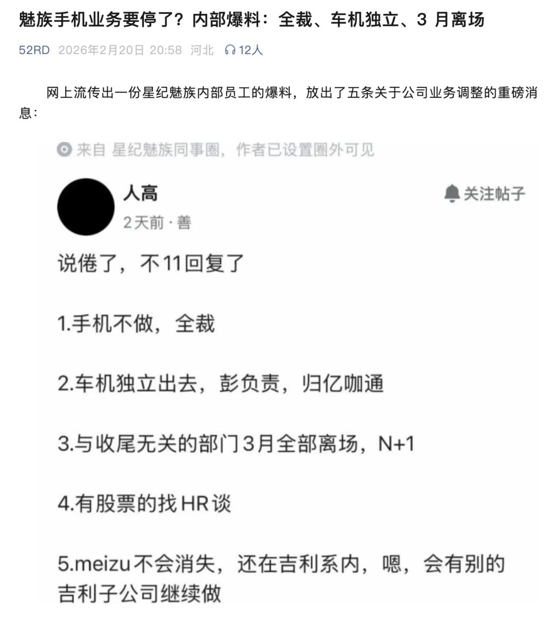 同时,网上流传出一份星纪魅族内部员工的爆料,其中透露了五条关于公司业务调整的重磅消息: