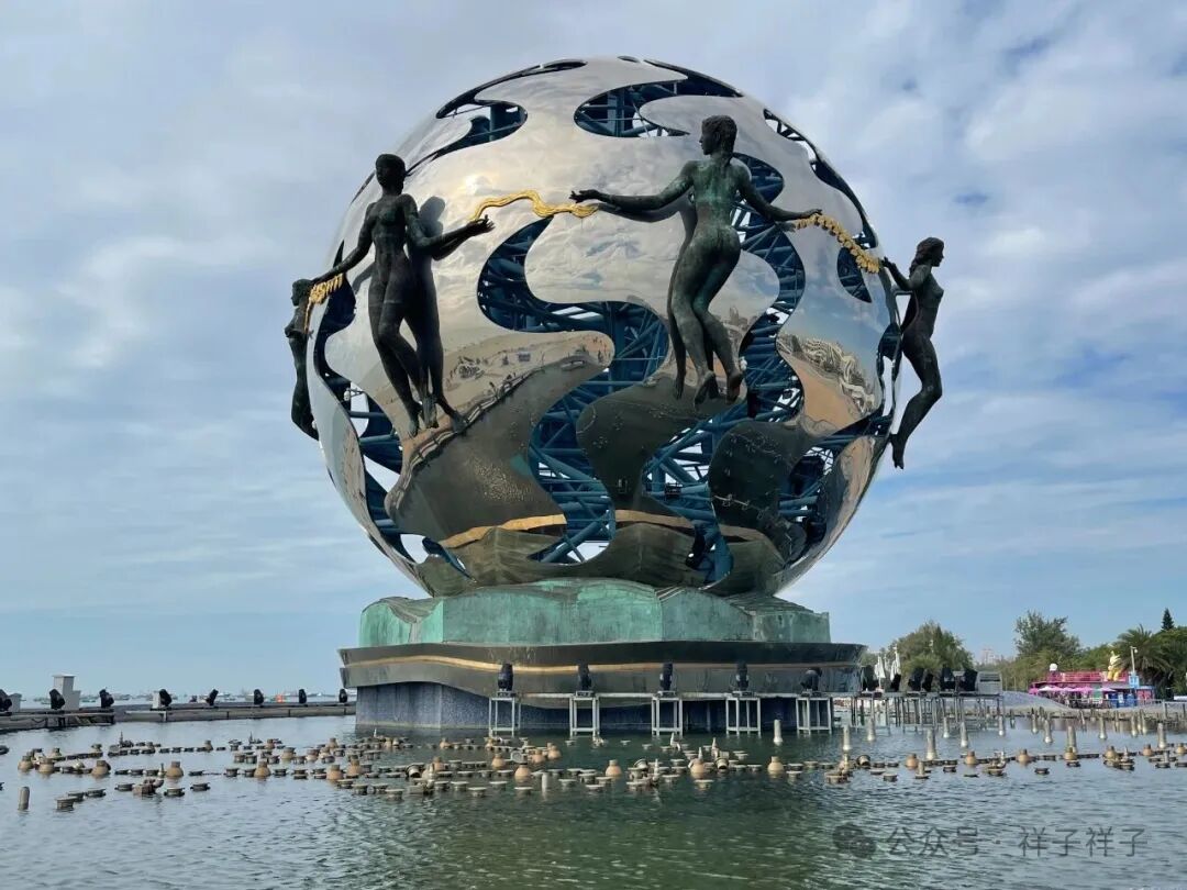来到银滩中心暂时停留,打卡著名的大型雕塑“潮”,外形是一个镂空的钢球,代表着北海蜚声海外的南珠,波浪纹象征潮水,七位美丽的采珠少女环绕,飘然起舞于空中,底座水池是一个大型的音乐喷泉。