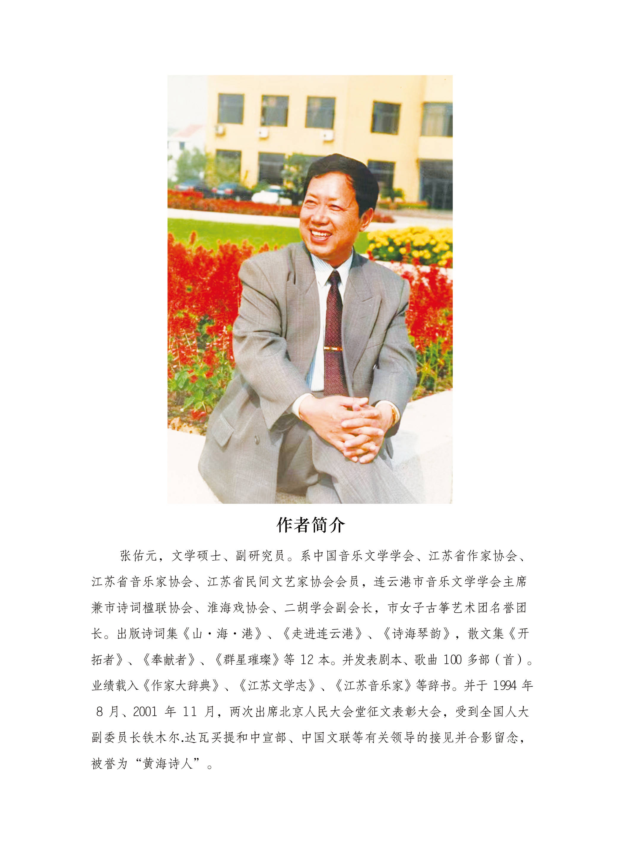 张佑元同志1993年出版诗词集《山·海·港》、2004年出版诗词集《走进连云港》后,今年又出版了第三本诗词集《诗海琴韵》。收录在这本诗集里,分“春之声”、“夏之歌”、“秋之月”、“冬之雪”四个部分,共计330首,大部分都是描写家乡风貌和他学琴、拉琴、听琴的感想,也是他长期担任宣传部门的领导工作和参于社会文艺团体活动的心得感悟。在琴瑟和鸣的黄海之滨,望着蓝天翱翔的海燕,听着巨轮启航的汽笛,纵览唐诗宋词,挥笔墨海冲浪,佑元同志写出并发表一首又一首现代导游诗赋、歌词、音乐,飘扬田野,传播社区,心为时代,情为人民。真是:“纵笔飞墨歌千里,琴瑟相韵奏九章;诗吟大港追新梦,词唱云台迎朝阳”。为此,表示热烈的祝贺。
