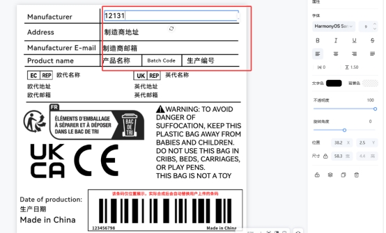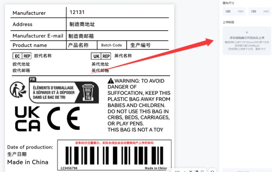 在编辑过程中,易可图支持多种功能模块,包括自定义绘制区域、条形码尺寸调整、CE 等合规图标库调用,以及常见安全警示语的快速插入。完成设计后,上传条形码文件并点击合成,即可导出标准的标签 PDF 文件,方便后续打印和使用。这种方式可以在保证合规性的同时,明显减少人工排版时间。