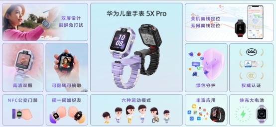 外观形态上,华为儿童手表5X Pro采用了可翻转、可摘取双面屏设计,精彩与专注并存。主屏功能丰富,翻转到副屏进入免打扰模式,守护孩子学习专注力。在智能化功能方面,华为儿童手表5X系列可摇一摇添加好友,支持微信儿童手表版和QQ儿童版,轻松实现跨品牌交友;支持NFC功能,抬抬手就能刷公交、刷门禁,孩子出行更便利;此外,还支持IPX8游泳级防水和多种运动模式。全新升级的华为教育中心提供了背单词、听儿歌、听名著等丰富学习内容,充分满足儿童日常出行、运动、探索和学习等需求。