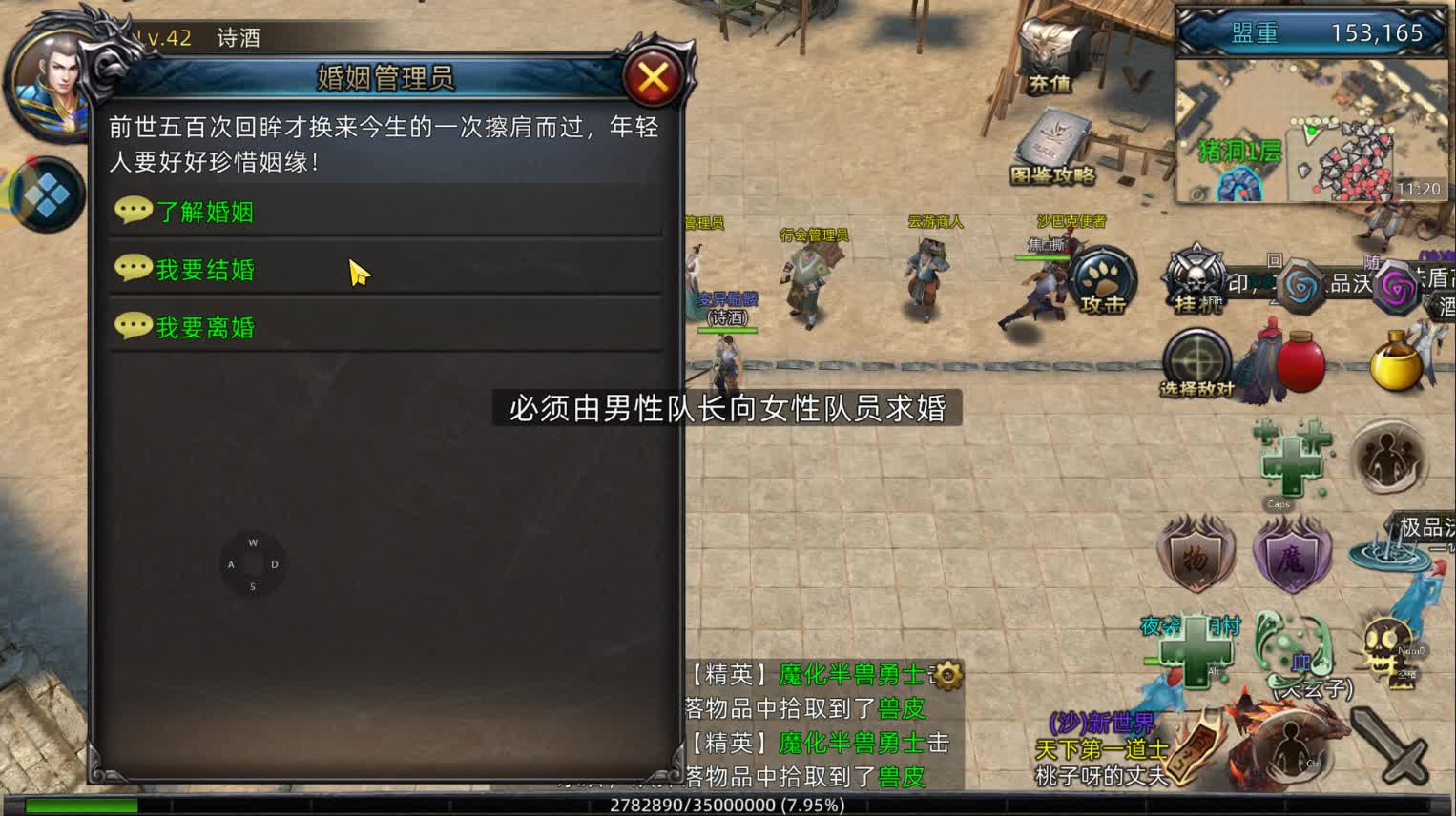 注意哦,需要双方都在30级以上,而且必须男性队长才能向女性队员求婚,双方还要有戒指才行,戒指可以在商店里买,这样再把人组队拉到这里,突然丢一个戒指给她,然后点击求婚,在盟重主城这么多人的注视下,行会战友的羡慕里,既不用怕社死,也仪式感满满的拿下对方,这多是一件美事啊。