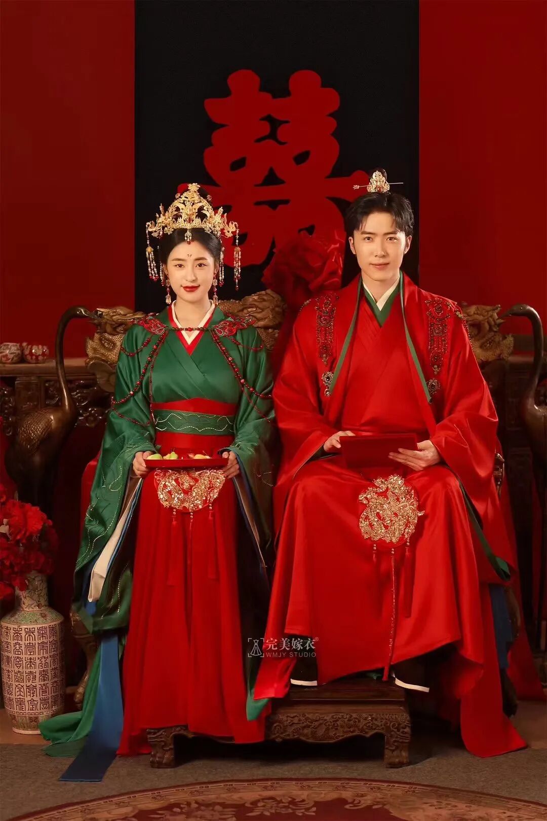 比如说婚礼吧,汉族传统婚礼根本不是大红。新娘的衣服主要是红色和青绿色系。新郎是以黑色、深蓝色为主。