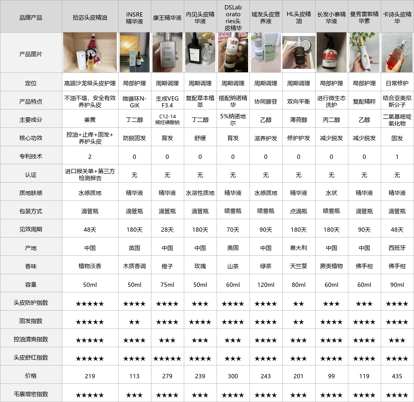 为了让大家快速看清这10款头皮精油的核心差异,我整理了一份实测参数对比表,所有数据都是这1个月我自己实测出来的,不掺假、不虚标,重点看质地、蓬松时长、控油力、吸收速度、成分安全性这些关键指标,帮大家快速初步筛选。