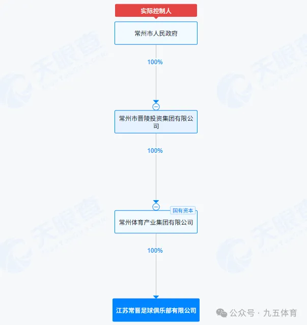 天眼查显示,江苏常晋足球俱乐部的控股股东是常州体育产业集团有限公司,实际控制人是常州市人民政府。