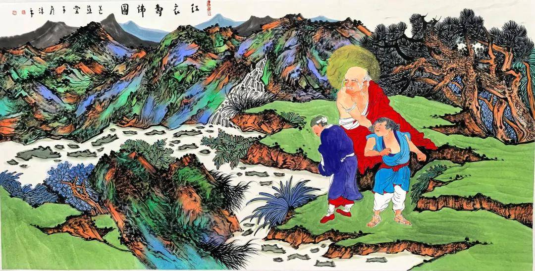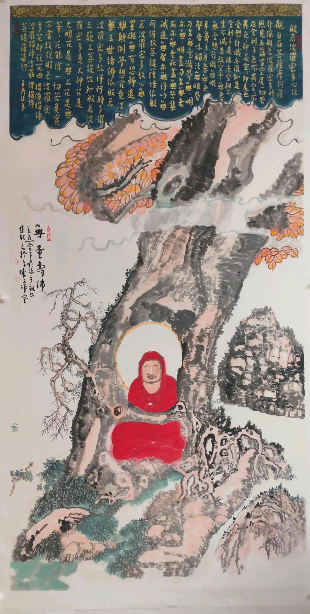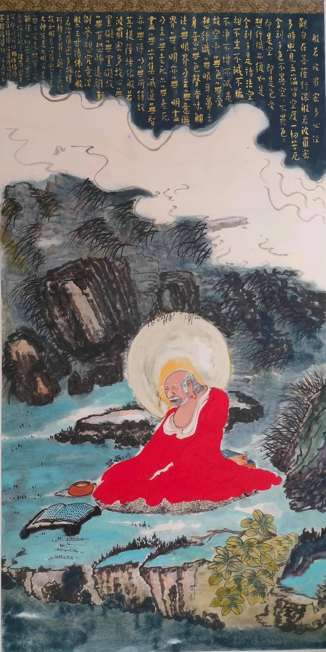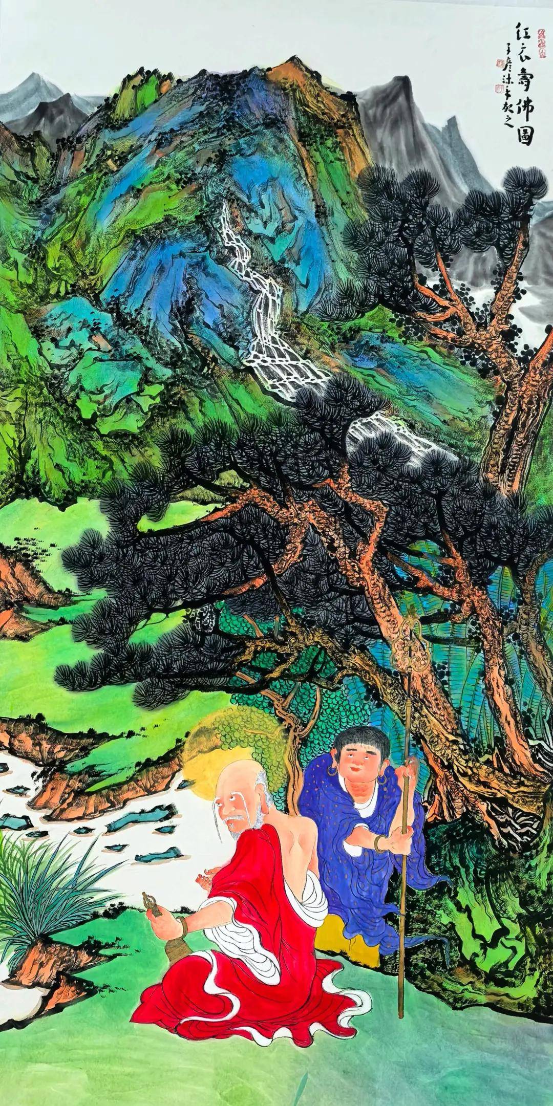 在艺术传承层面,周晶坚守了中国画的核心价值。他始终强调“笔性即心性”,将书法功底融入绘画,使线条具备书写性与生命力,这与当代部分佛画“重技法轻内涵”的倾向形成鲜明对比。其作品中的题款与绘画相映成趣,如红衣罗汉图上“心无挂碍,色即是空”的题跋,既是对画面意境的点化,也是禅理的直接表达,延续了中国画“诗书画印”一体的传统。而在题材开拓上,他对佛窟山水的系统创作,则填补了中国画的题材空白,丰富了传统禅画的表现维度,践行着“承古而不泥古,创新而不忘本”的艺术理念。