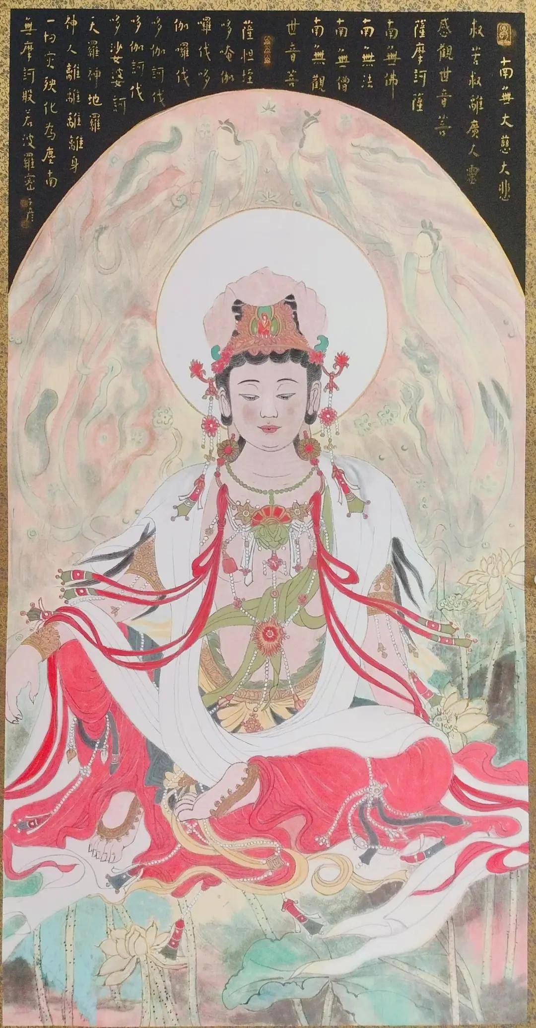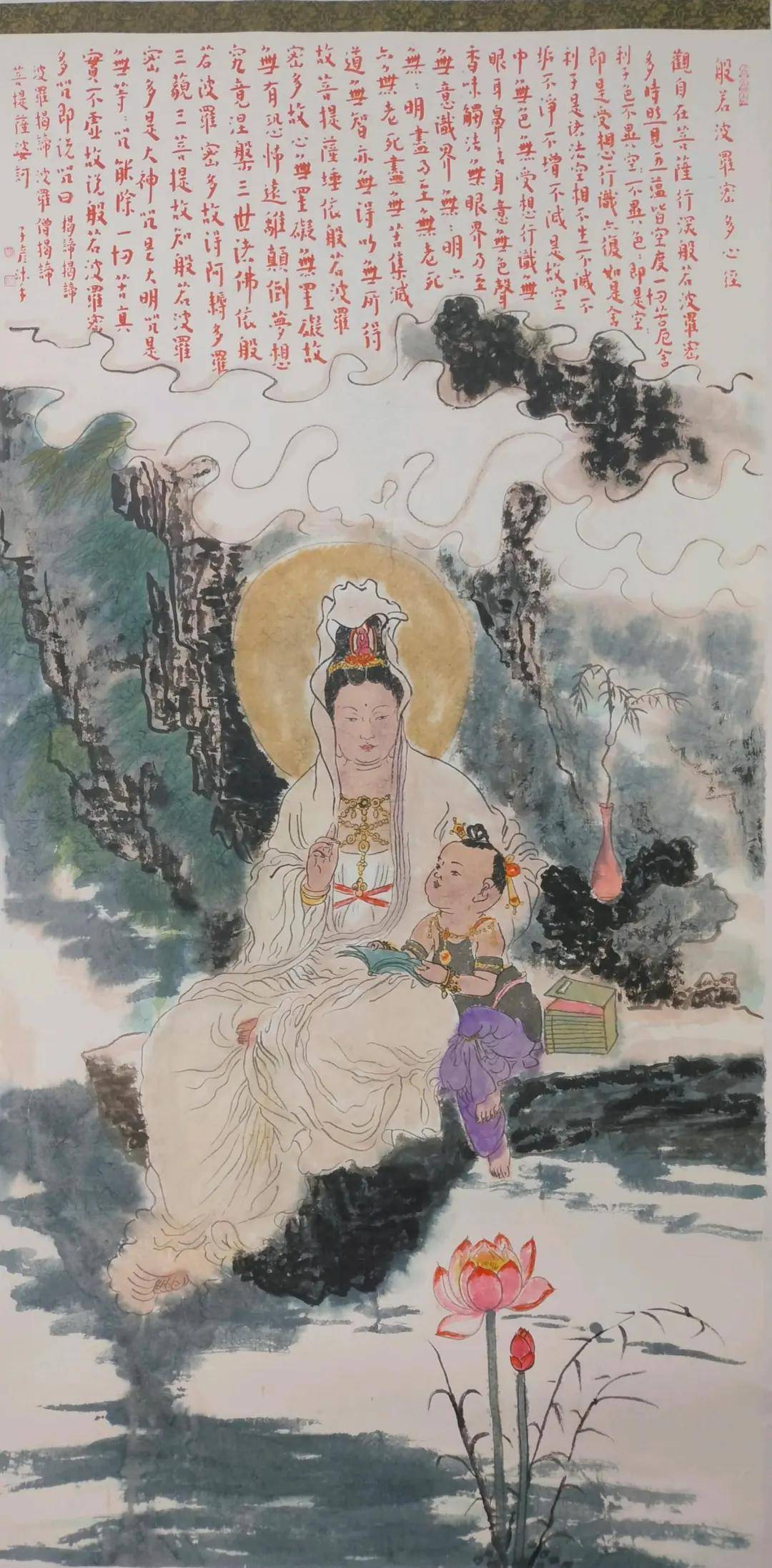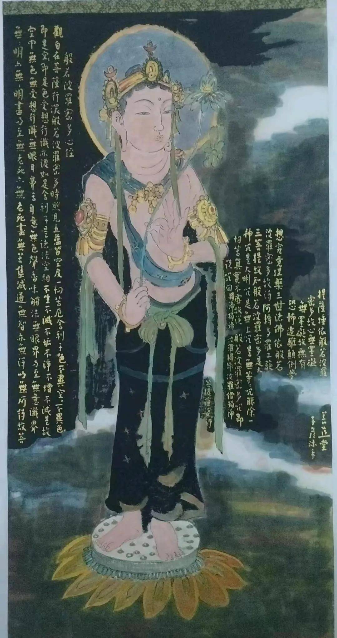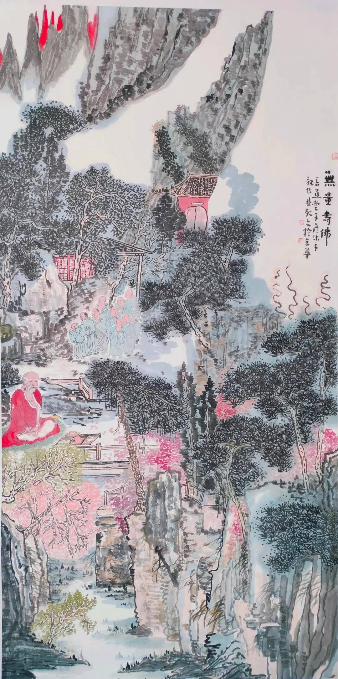 在艺术传承层面,周晶坚守了中国画的核心价值。他始终强调“笔性即心性”,将书法功底融入绘画,使线条具备书写性与生命力,这与当代部分佛画“重技法轻内涵”的倾向形成鲜明对比。其作品中的题款与绘画相映成趣,如红衣罗汉图上“心无挂碍,色即是空”的题跋,既是对画面意境的点化,也是禅理的直接表达,延续了中国画“诗书画印”一体的传统。而在题材开拓上,他对佛窟山水的系统创作,则填补了中国画的题材空白,丰富了传统禅画的表现维度,践行着“承古而不泥古,创新而不忘本”的艺术理念。