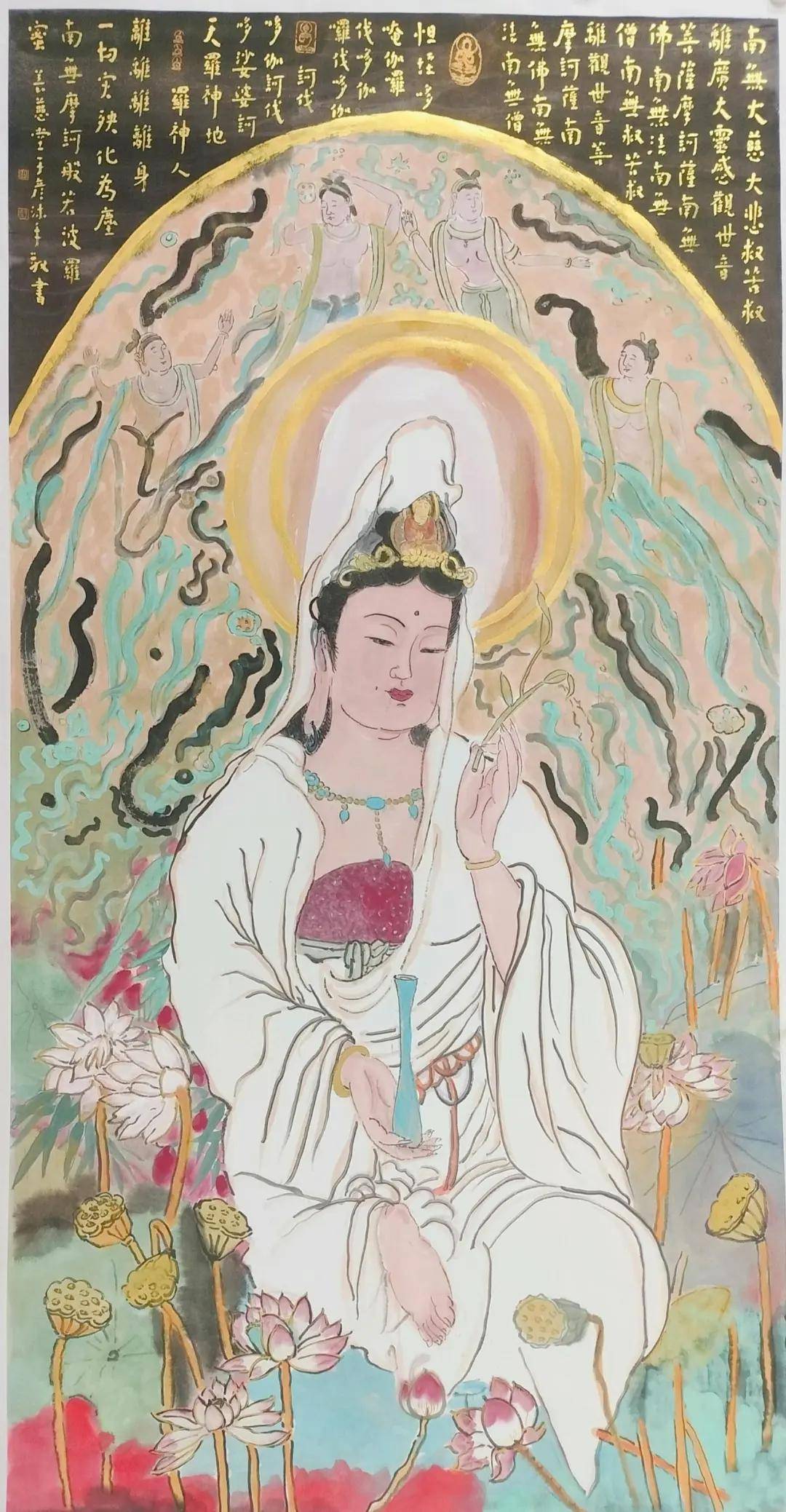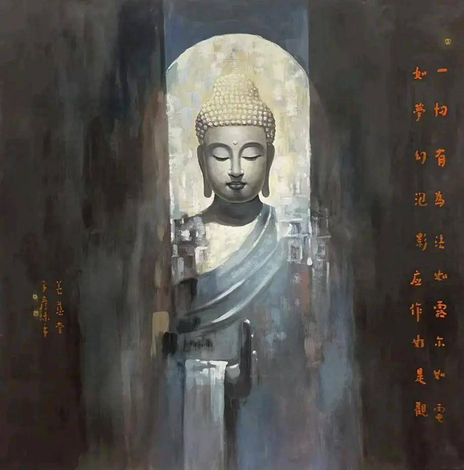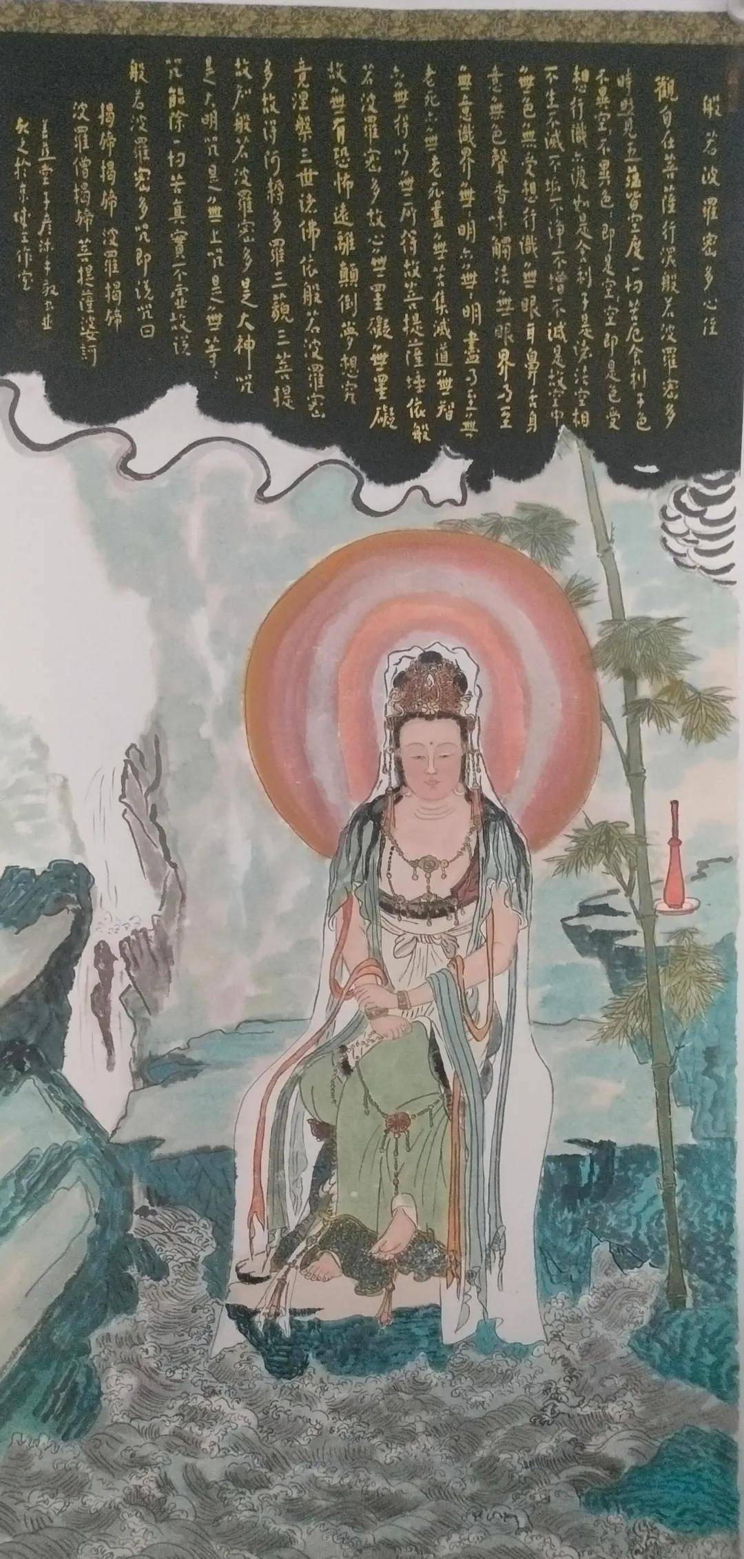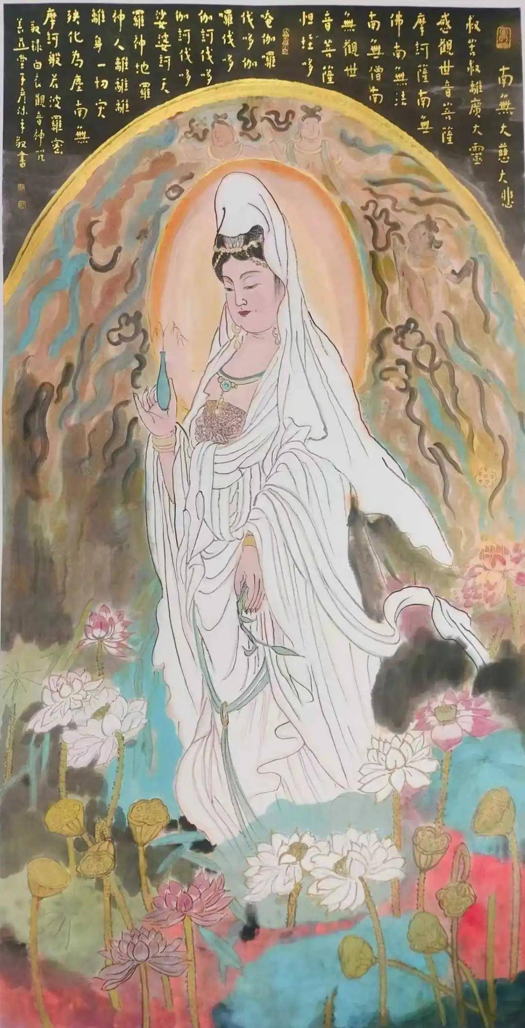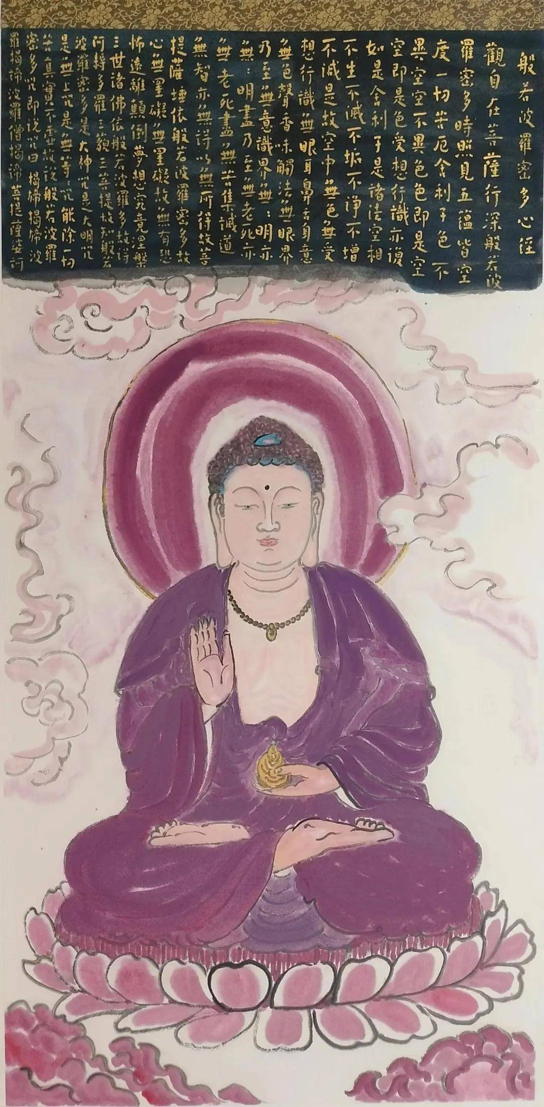 在艺术传承层面,周晶坚守了中国画的核心价值。他始终强调“笔性即心性”,将书法功底融入绘画,使线条具备书写性与生命力,这与当代部分佛画“重技法轻内涵”的倾向形成鲜明对比。其作品中的题款与绘画相映成趣,如红衣罗汉图上“心无挂碍,色即是空”的题跋,既是对画面意境的点化,也是禅理的直接表达,延续了中国画“诗书画印”一体的传统。而在题材开拓上,他对佛窟山水的系统创作,则填补了中国画的题材空白,丰富了传统禅画的表现维度,践行着“承古而不泥古,创新而不忘本”的艺术理念。