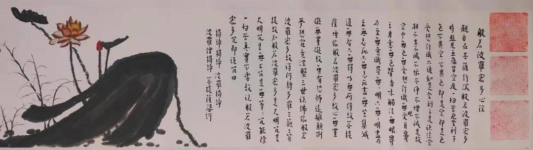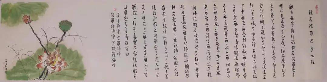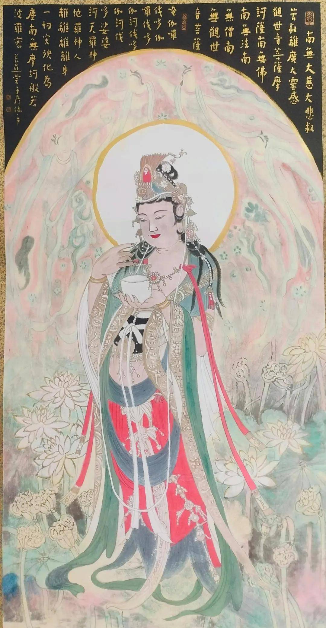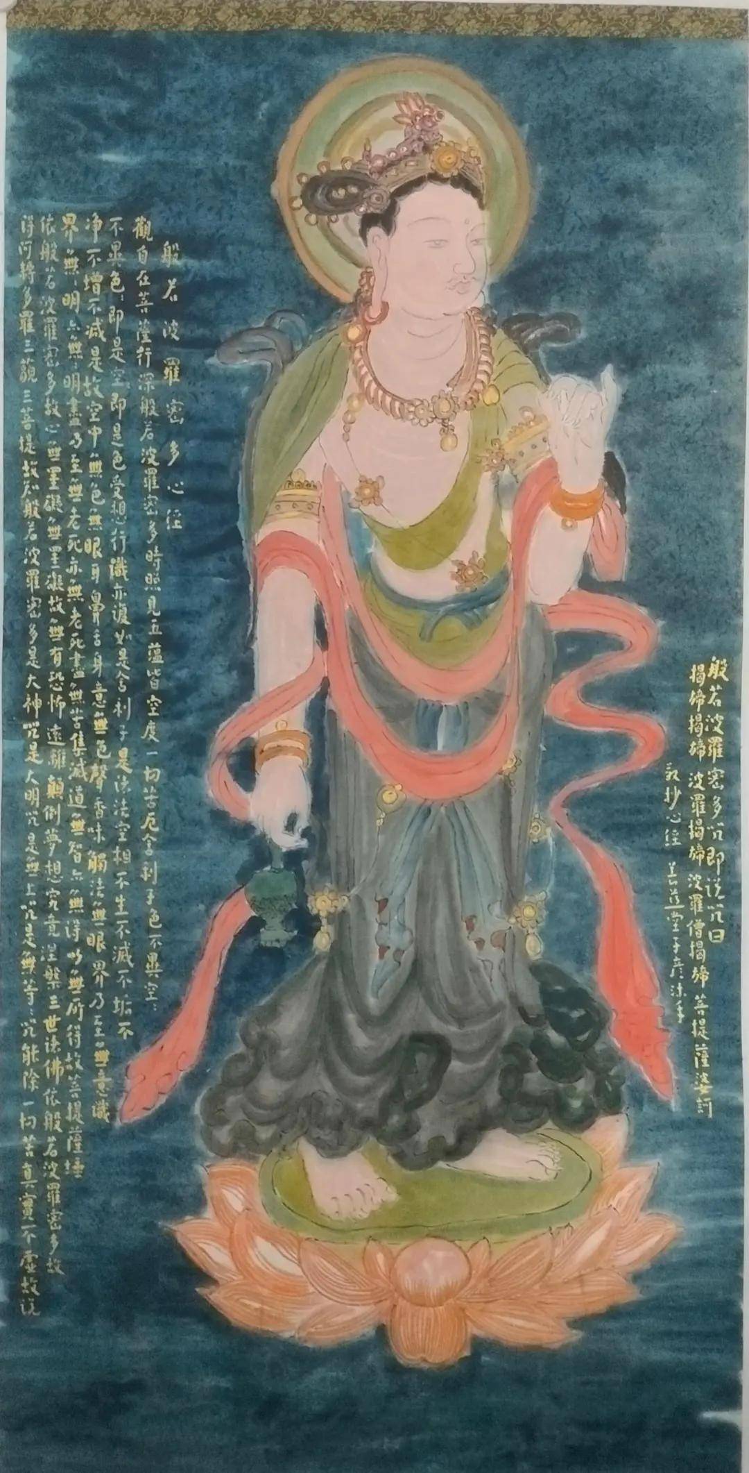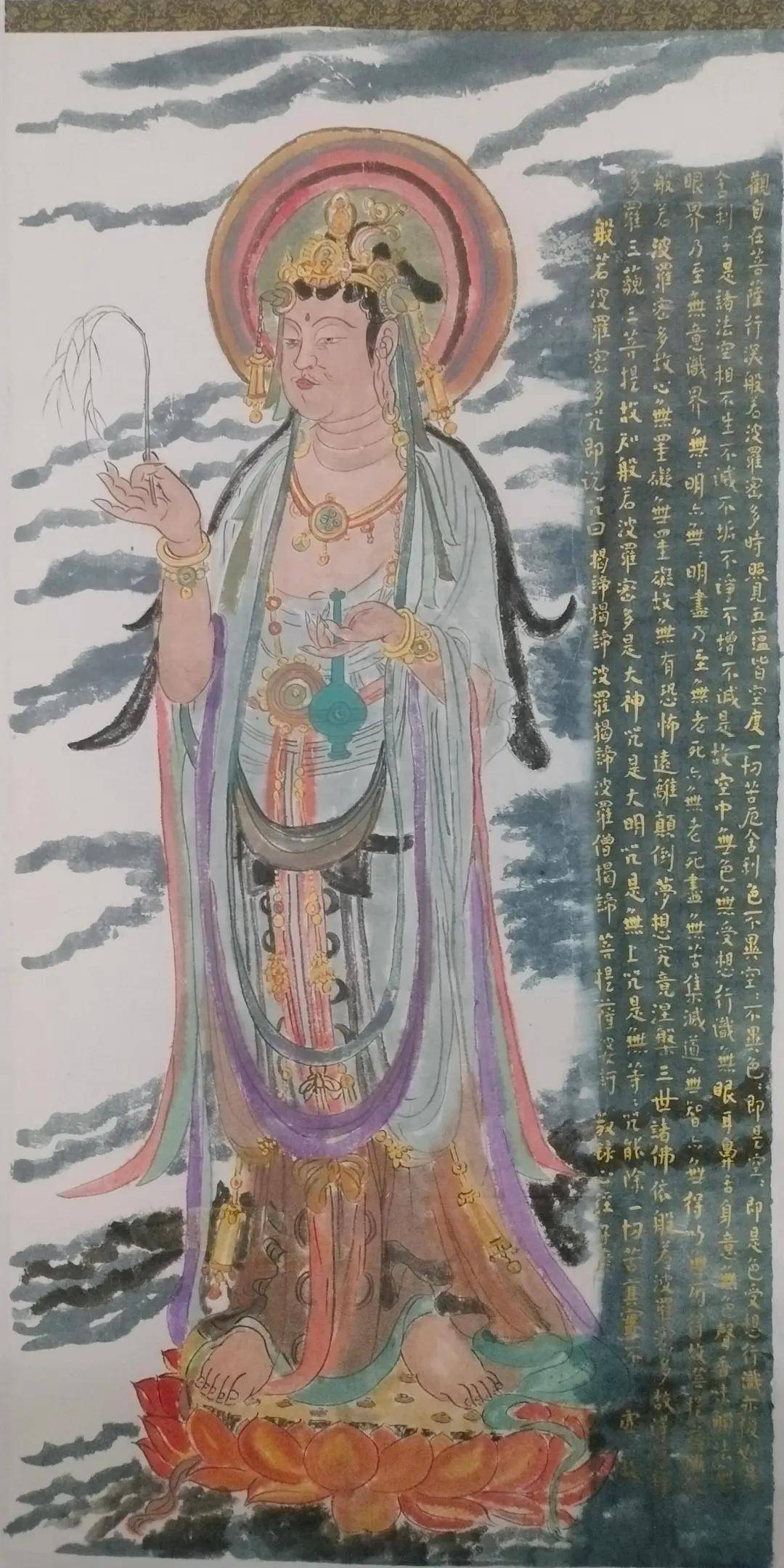 在艺术传承层面,周晶坚守了中国画的核心价值。他始终强调“笔性即心性”,将书法功底融入绘画,使线条具备书写性与生命力,这与当代部分佛画“重技法轻内涵”的倾向形成鲜明对比。其作品中的题款与绘画相映成趣,如红衣罗汉图上“心无挂碍,色即是空”的题跋,既是对画面意境的点化,也是禅理的直接表达,延续了中国画“诗书画印”一体的传统。而在题材开拓上,他对佛窟山水的系统创作,则填补了中国画的题材空白,丰富了传统禅画的表现维度,践行着“承古而不泥古,创新而不忘本”的艺术理念。