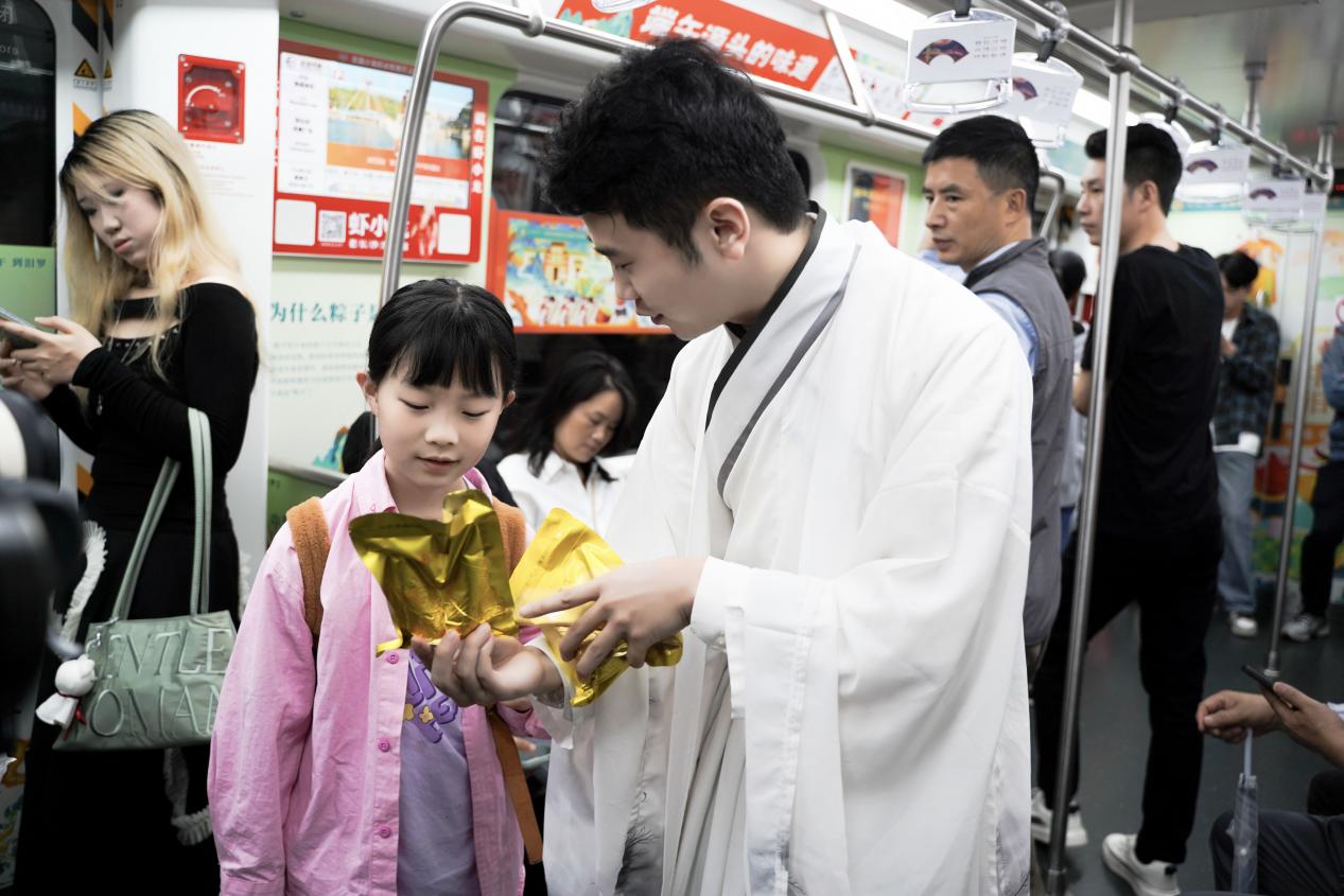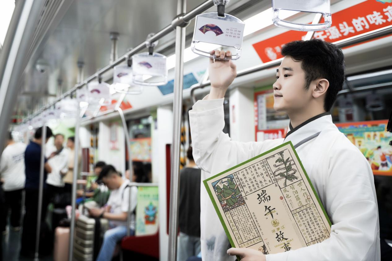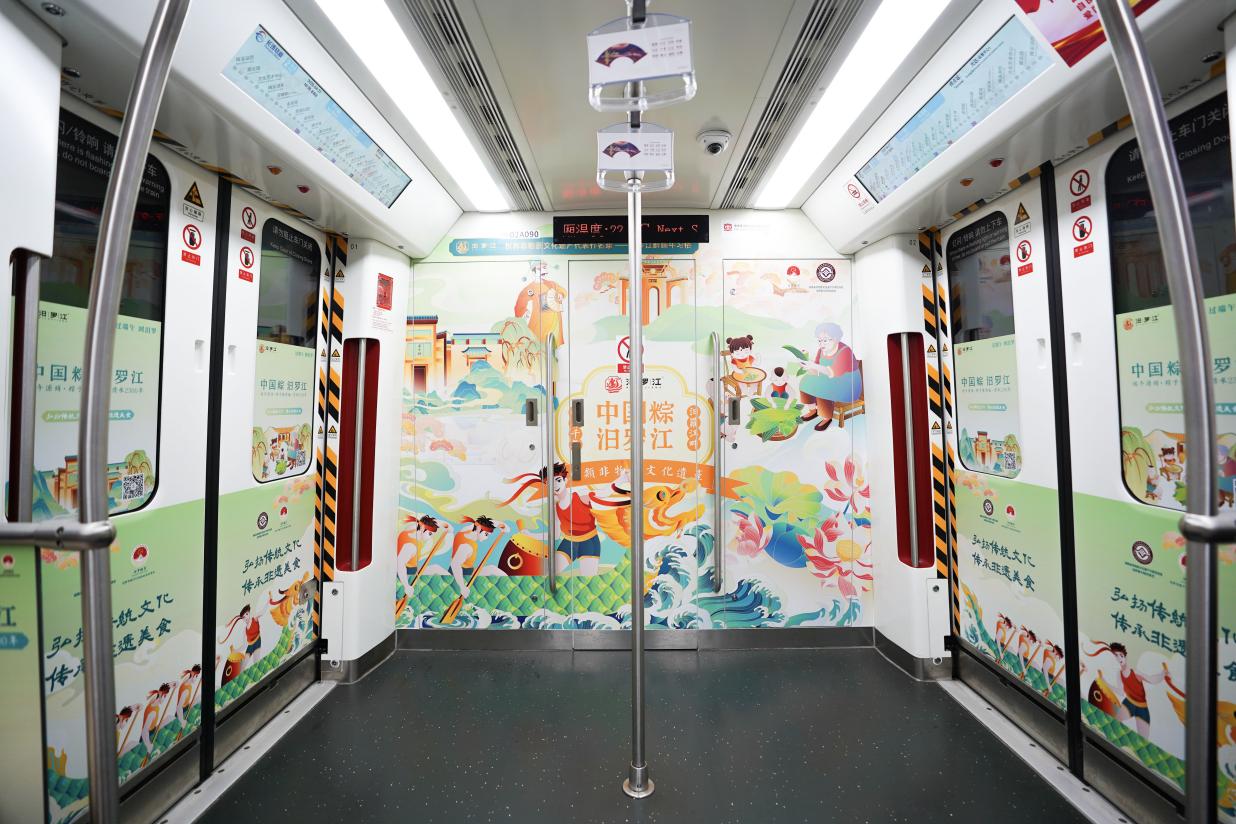 缓步走进主题列车,一阵古朴典雅的气息便扑面而来。即便置身于地铁车厢内,也仿佛能“身临其境”地感受到汨罗江畔龙舟竞渡的壮观场景,解密“牛角粽源起”“端午源头考”等文化密码,体验“流动的文化课堂”。