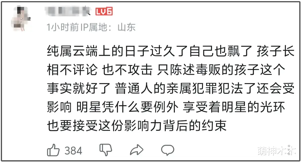 试想一下,毒贩女儿做明星美美赚钱,无名英雄的子女反而要低调行事,还有可能亲眼看到毒贩女儿光鲜亮丽的生活,就像抵制劣迹艺人复出,大家针对的不是黄奕女儿,更多是认为不应该给毒贩任何洗白机会,毒贩子女可以做正常工作生活,但不能具有社会影响力——某种程度上,黄奕把女儿推到公众面前曝光的行为就是不恰当的。