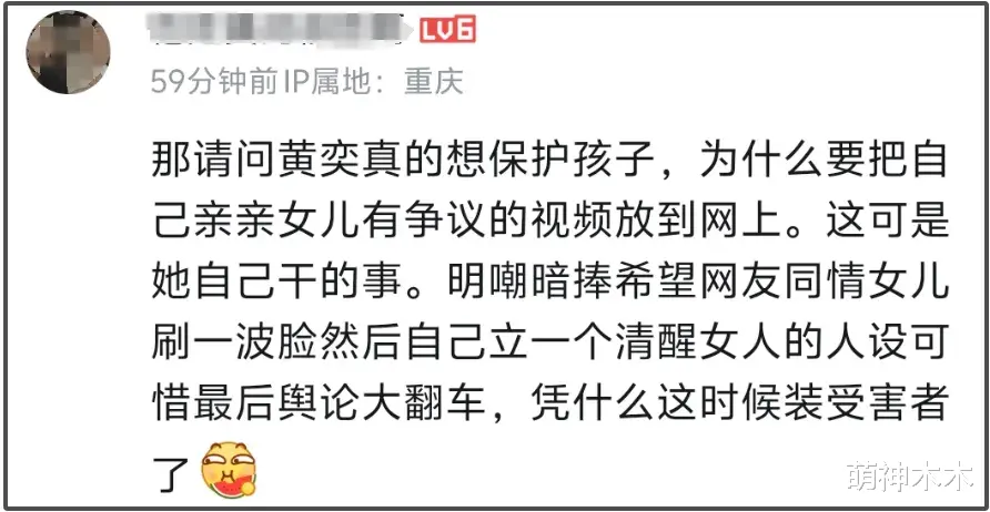 面对网友抵制,黄奕从始至终没有意识到自己的问题,还在直播中嘲讽起了网友,声称提及毒贩女儿的人都是水军,来了一句“他(前夫)贩毒和我们(自己和女儿)没关系”,同时不忘给女儿卖惨,话里话外她只是一个12岁的小女孩,莫名其妙被黑太惨了,丝毫不提正是她自己把女儿一手推进舆论风暴里。