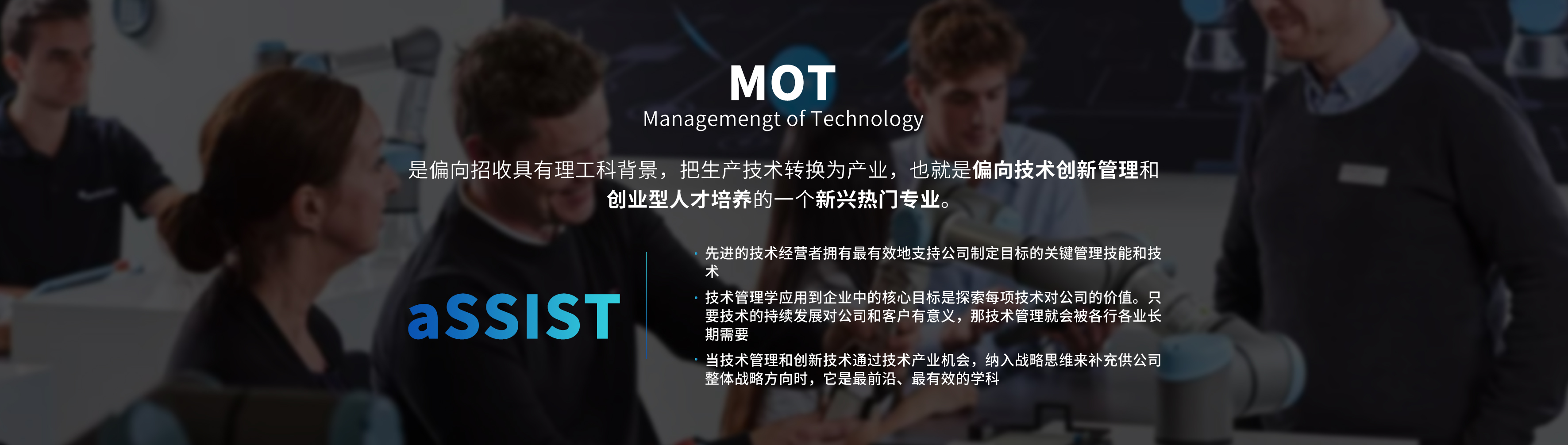 MOT全称Managemengt of Technology, 技术管理硕士。是偏向招收具有理工科背景,把生产技术转换为产业,也就是偏向技术创新管理和创业型人才培养的一个新兴热门专业。