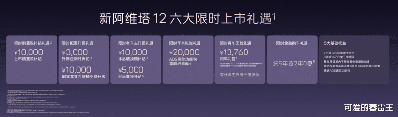 新阿维塔12定位未来智能豪华轿车,面向时代精英人群,主打豪华、智能、旗舰级出行体验。新车全系标配12项顶格配置,涵盖华为乾崑智驾全系统、太行智控2.0、35.4英寸4K全景星环屏、25扬英国之宝音响、全车9安全气囊等,百万豪车顶配选装功能悉数标配。同时推出六大限时购车礼遇,购置税补贴礼遇、配置升级礼遇、老车主升级礼遇、ADS高阶包抵扣权益、贷5年首2年0息金融礼遇、万元用车无忧礼遇,入门即满配,彻底打破豪华门槛。