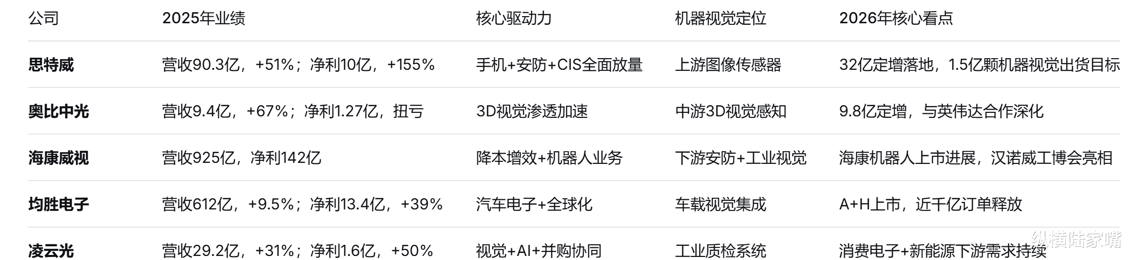 海康威视是下游的安防和工业视觉巨头;思特威是上游的CMOS图像传感器(CIS)龙头;奥比中光是中游的3D视觉感知核心玩家;均胜电子是汽车领域的智能化集成商;凌云光是工业视觉检测系统的“隐形冠军”。