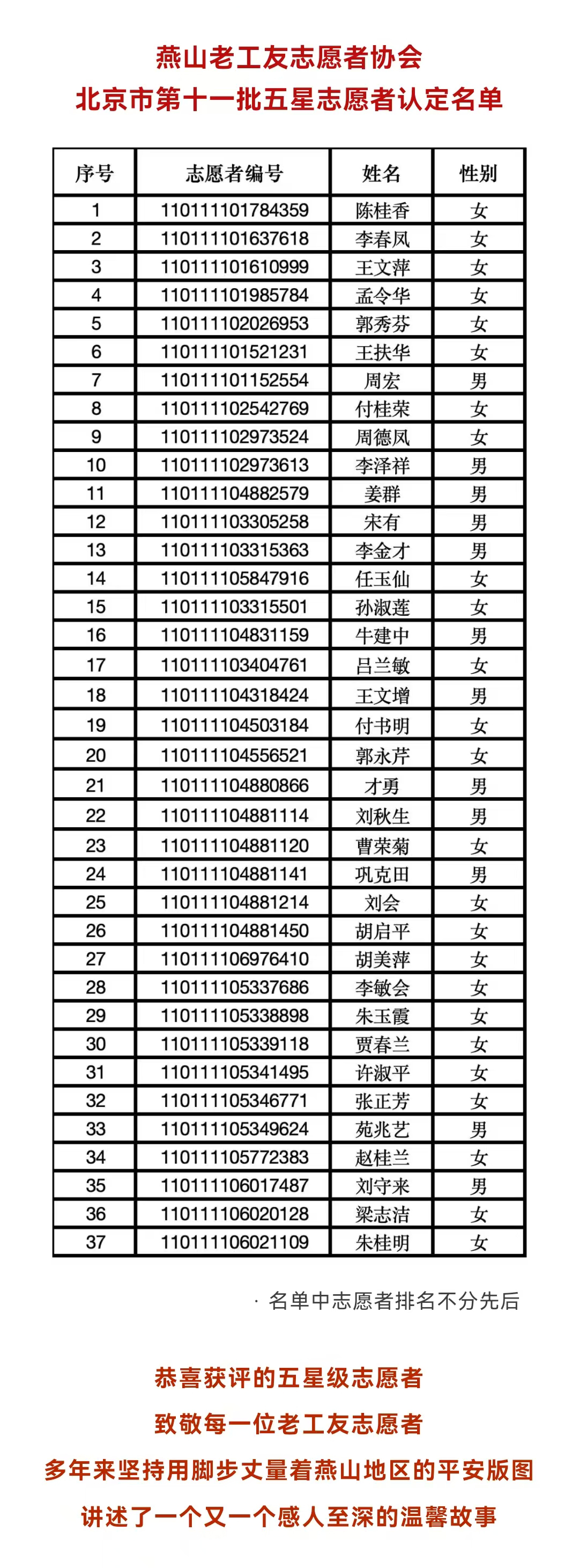 为弘扬“奉献、友爱、互助、进步”的志愿精神,表彰在志愿服务中表现突出的先进个人,北京市志愿服务联合会公布了北京市第十一批五星级志愿者认定结果。经严格审核与公示,老工友志愿者协会37名志愿者光荣上榜!荣获“北京市五星级志愿者”称号。