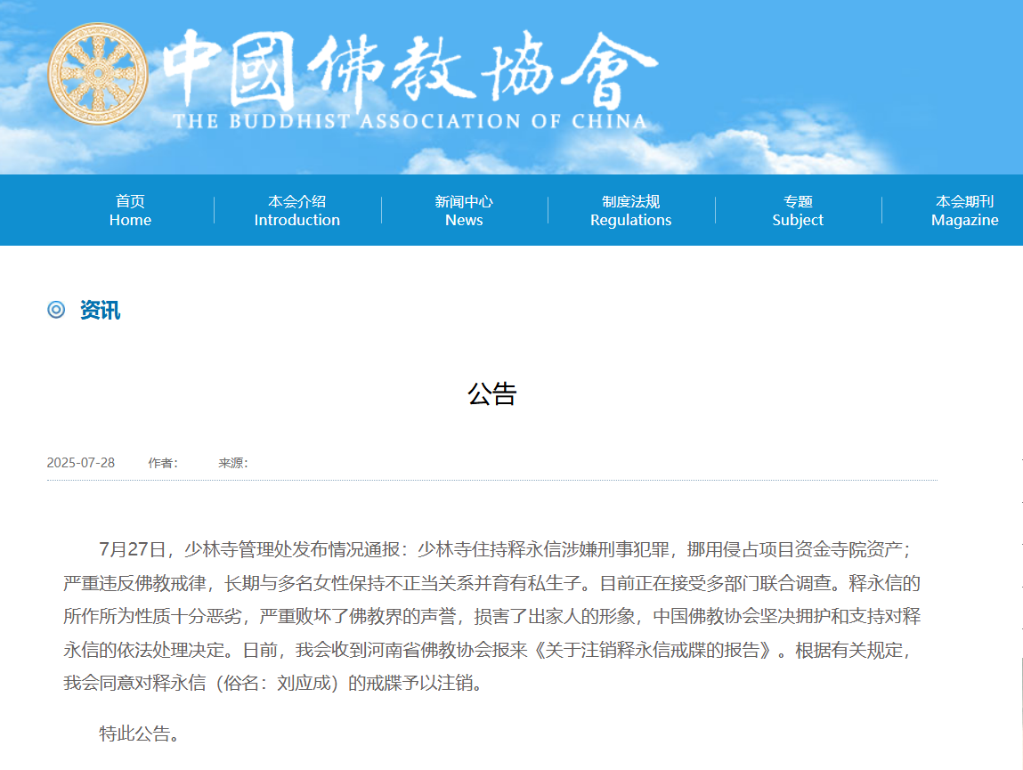 在少林寺管理处“官宣”释永信被查后的第二天,中国佛教协会也发布公告,宣布同意对释永信的戒牒予以注销。