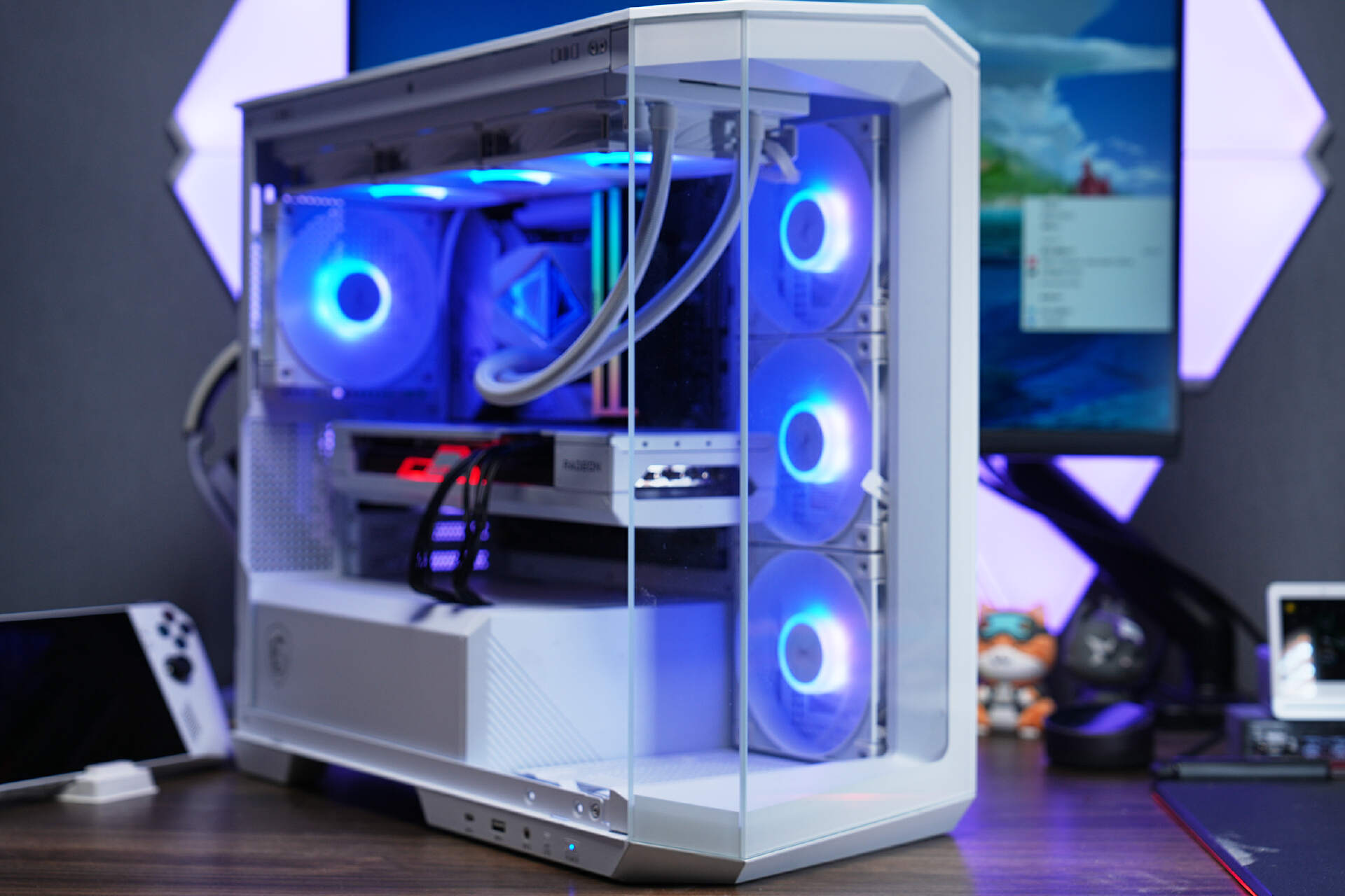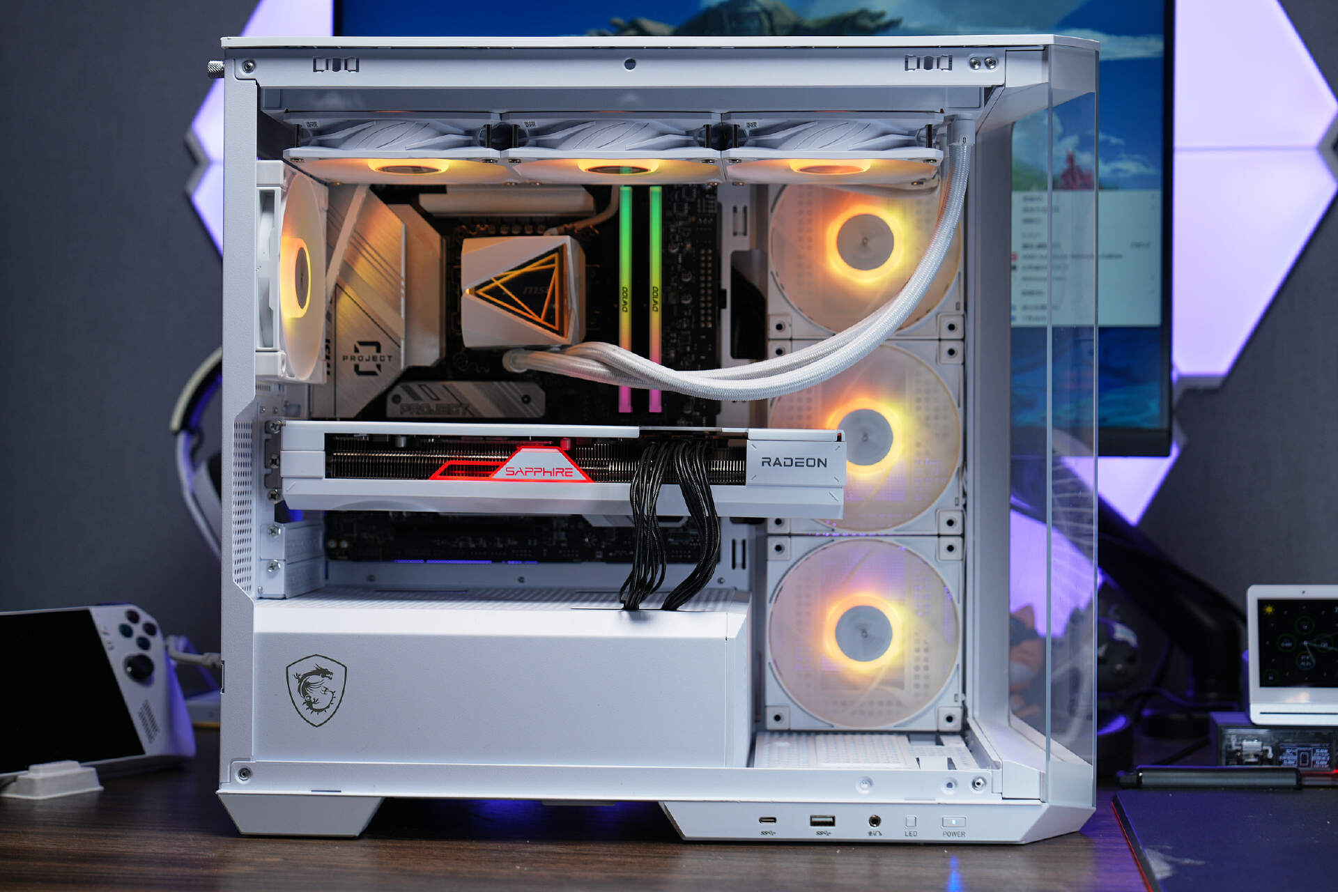 整机点亮以后RGB还是拉满,尤其是MAG PANO M100L PZ WHITE 白刃海景房机箱,实际除了水冷以外还可以再加7把风扇,这边我加了4把也够了,当然你想拉满还可以加两把,总共可加是10把风扇。