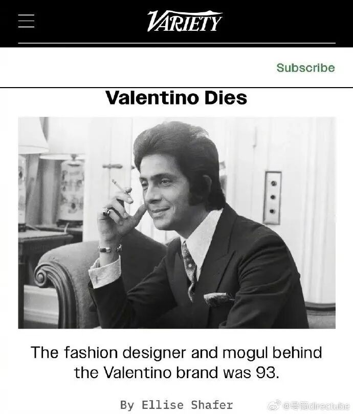 意大利著名时尚设计师瓦伦蒂诺·加拉瓦尼(华伦天奴)于本周一在罗马去世,享年93岁。