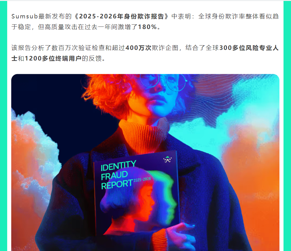 国际身份验证服务平台Sumsub 1月20日发布的《身份欺诈报告2025-2026》显示,与2024年相比,2025年采用先进技术、社会工程学及人工智能生成身份的"精密欺诈"案例增长180%。亚太地区成为全球欺诈风险上升最快、形态变化最剧烈的地区,合成身份、深度伪造、自主运行的AI欺诈代理正在取代简单投机性诈骗。84%的欺诈个案导致用户账户被盗,包括69%的社交媒体账号和15%的政府门户网站账号。报告警告,欺诈模式正从即时获利转向夺取目标用户身份与账户控制权。