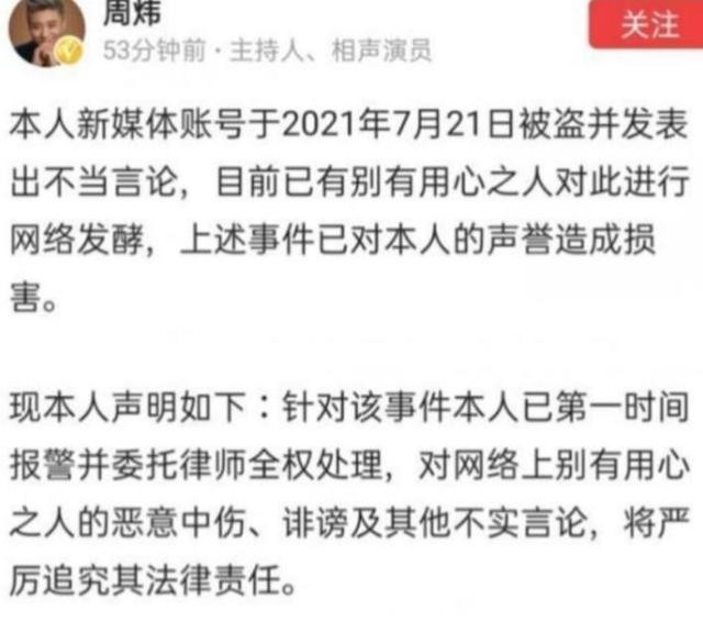 称账号被盗,那些不当言论并非他本人所发,希望公众能够理解和相信。