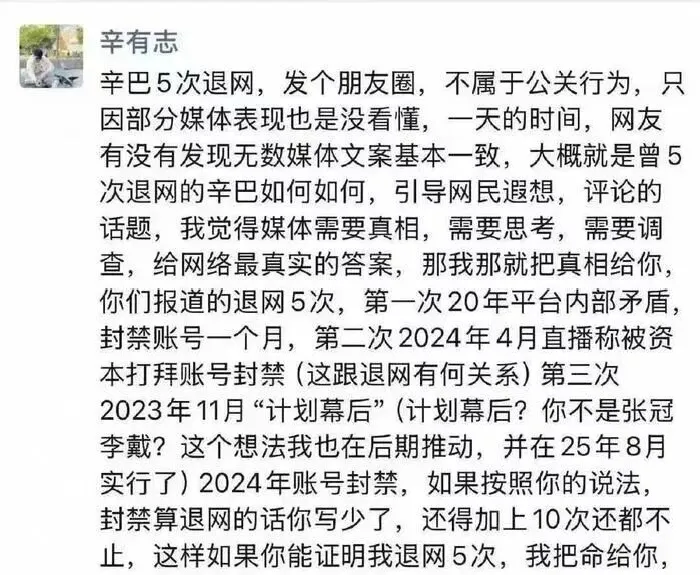说到底,“五次退网”不是媒体凭空杜撰的,五次都是辛巴自己在公开渠道说的话。封禁是不是退网?从语义学上讲,封禁是被动,退网是主动,确实不同。