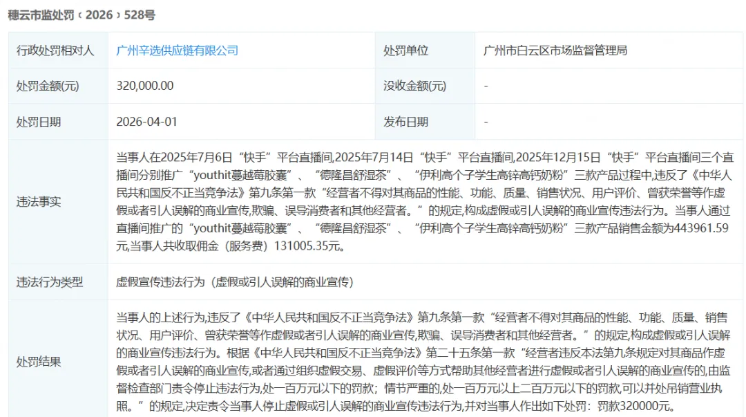 就在辛巴高调收徒的同一时间,他实际控制的广州辛选供应链有限公司,因为涉嫌对优思益蔓越莓胶囊等产品进行虚假宣传,刚被广州市白云区市场监督管理局罚了32万元。三款产品卖了约44万元,辛选光服务费就抽了13万元,抽佣比例接近30%。