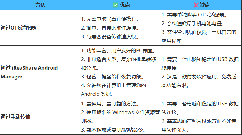 结论现在您已经学会了三种将安卓手机照片传输到U盘的有效方法。您甚至可以使用iReaShare Android Manager在电脑上管理照片。有了这款软件,无论您是想传输、备份、恢复还是整理文件,都能轻松完成。