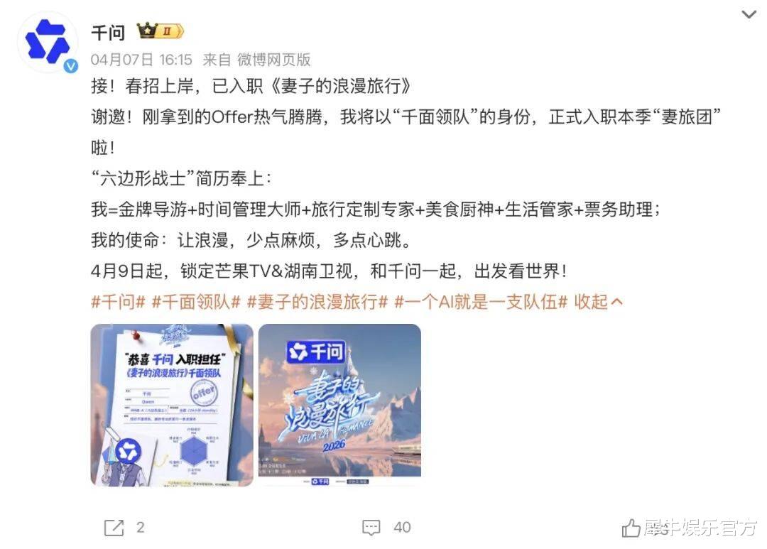 作为阿里系AI产品的排头兵,千问在今年初就曾砸好几十亿押注B站跨年晚会、河南卫视春晚等多台高注意力晚会寻求多维曝光,但此次冠名《妻子的浪漫旅行2026》,却是它第一次投放长周期、强场景的综艺节目。